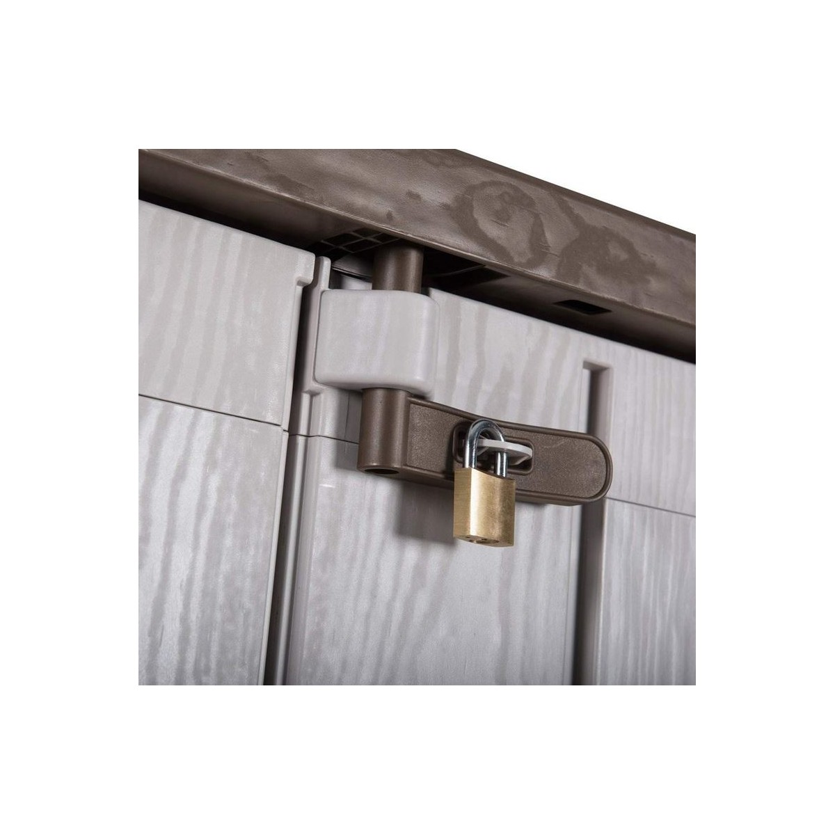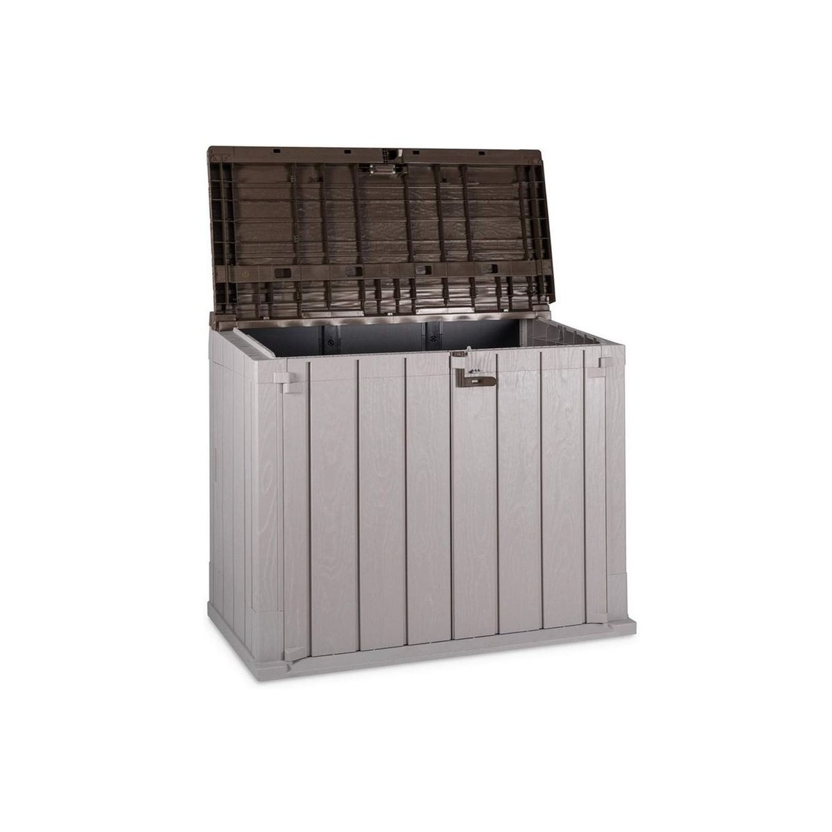 Son design attrayant, avec des panneaux à l'effet bois contrastés gris et marron, confère à ce coffre une esthétique harmonieuse qui s'intègre parfaitement dans tous les jardins.
