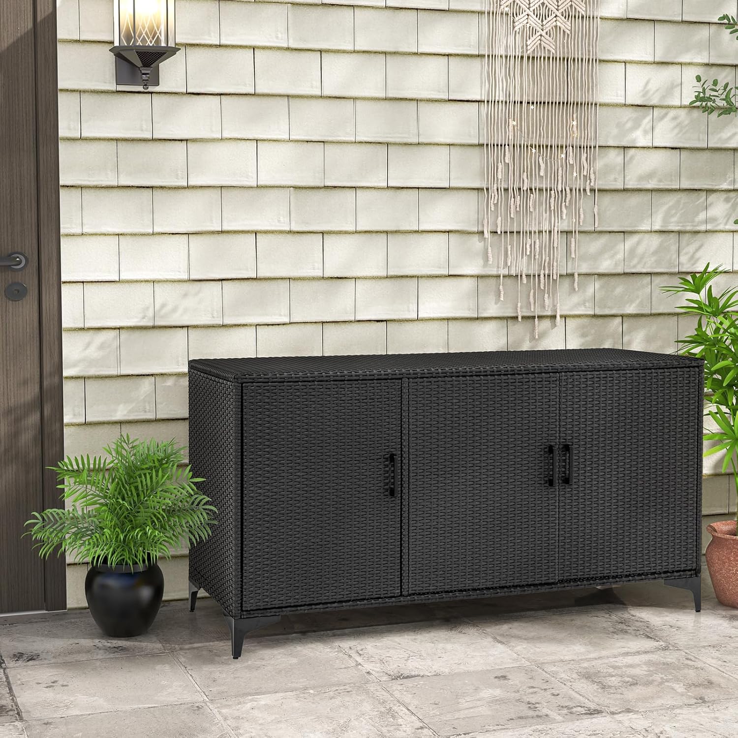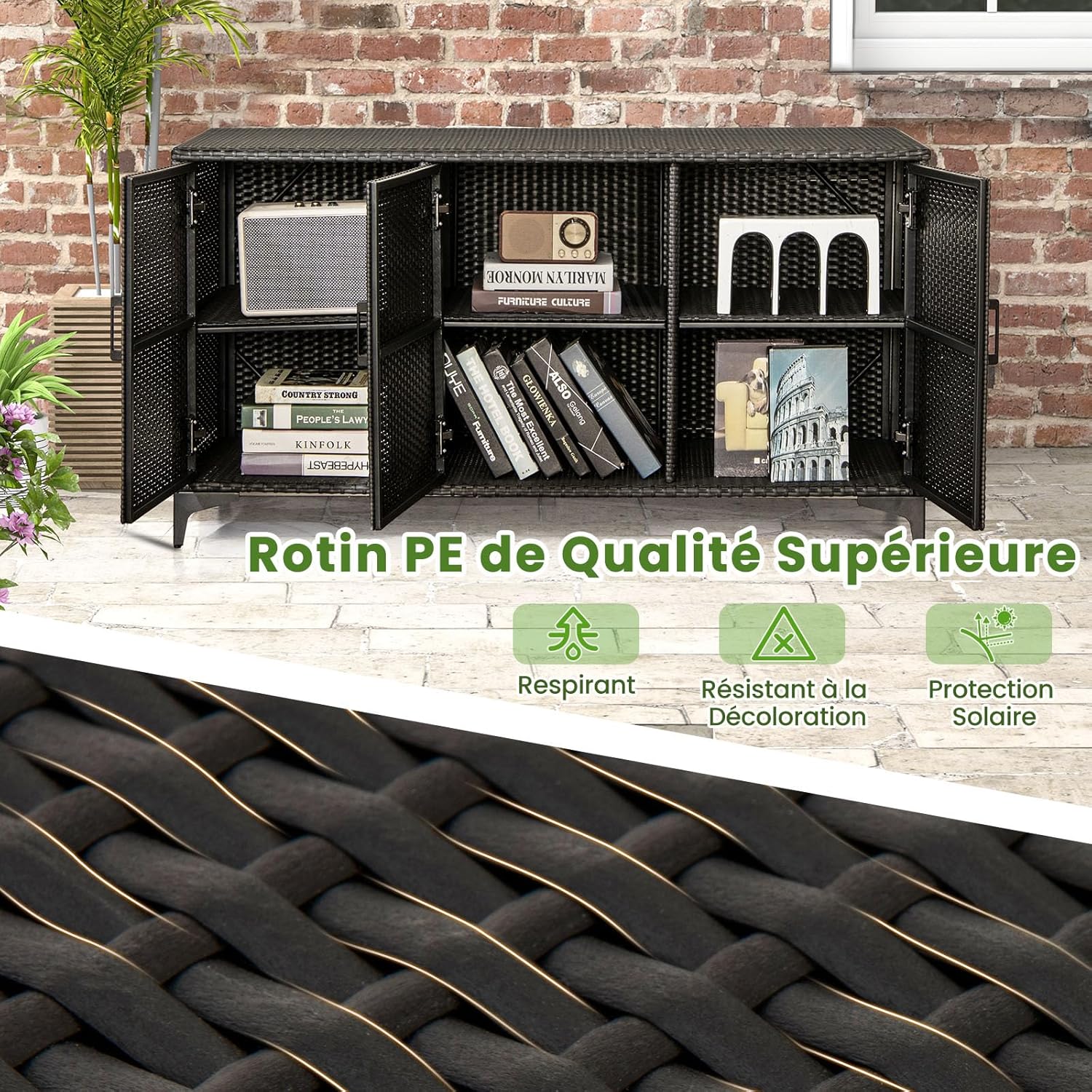 - Meuble de Terrasse Polyvalent : Le meuble de terrasse en rotin d'extérieur complète toute décoration extérieure tout en offrant un rangement pratique. Il sera applicable à divers environnements extérieurs, comme les jardins, les patios, les bords de piscine, les porches.