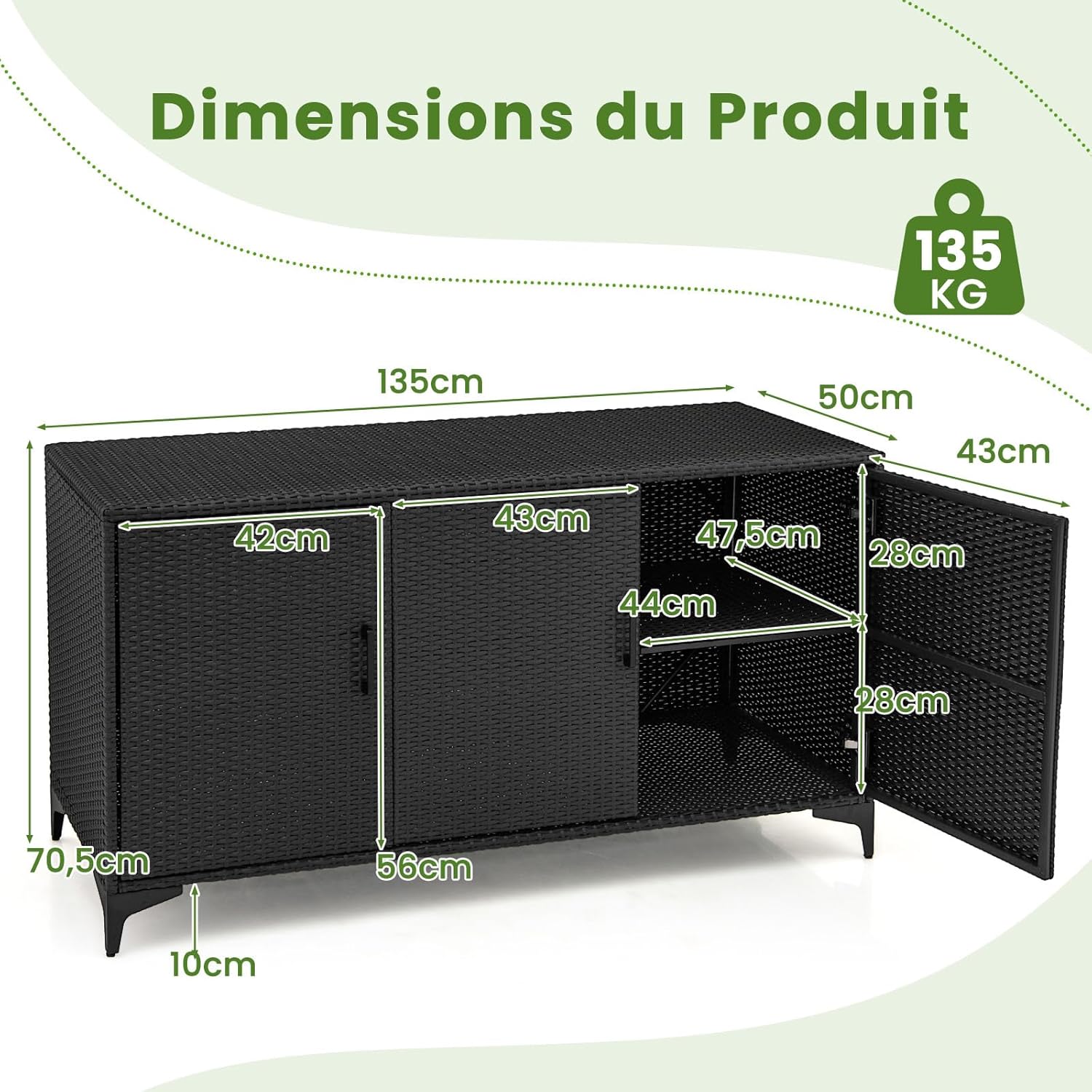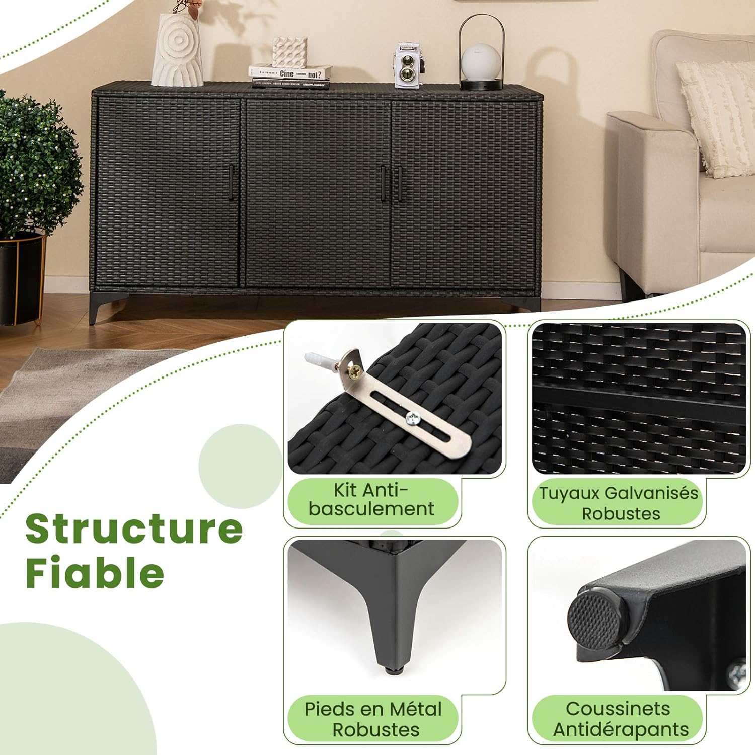 Notre meuble de terrasse en rotin d’une capacité de 318 L est parfait pour ranger des outils de jardin et des accessoires, parfait pour la maison, le jardin et la terrasse. Avec les étagères intérieures retirées, vous pouvez facilement ranger des objets plus volumineux. Les 3 portes et la doublure imperméable protégeront les articles intérieurs. Fabriqué en rotin PE, il est résistant aux intempéries pour des années d'utilisation. Le cadre galvanisé robuste assure un soutien solide et le kit anti-basculement ajoute une stabilité. C’est le complément parfait à votre.