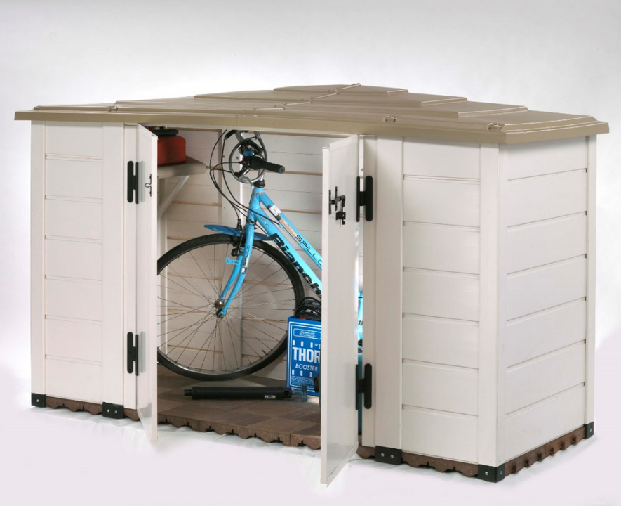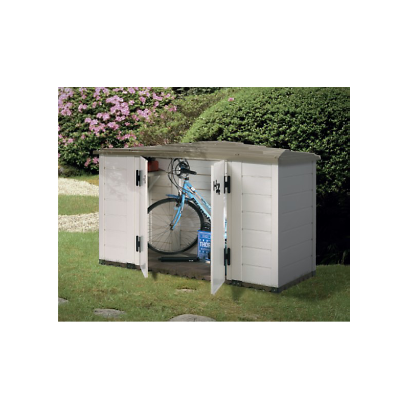 box evo 200 - coffre de jardin résine 1930l beige/marron - Coffre de jardin BOX EVO 200 HABRITA a une capacité de stockage de 1 930 litres vous procure l'essentiel pour votre rangement pour un encombrement réduit. Ses doubles portes maximalisent la capacité de passage pour vous permettre d'utiliser au mieux la surface de stockage. Condamnable par la pose d'un cadenas (non fourni), cet abri protègera son contenu des enfants, des animaux ou des visites indésirables. Sa structure en résine ne nécessite aucun entretien et assure une longévité dans le temps, doublée d'une garantie de 5 ans de la structure. Son esthétique et sa couleur discrète s'intègreront parfaitement dans votre jardin. Compromis idéal et économique à la construction d'un abri en dur, il se monte très facilement. Il est livré avec un plancher en dalle de 40x40x4,5 cm très lourd qui permet d'installer l'abri directement sur le plancher sans réaliser de dalle béton. De plus, la grosse épaisseur des dalles isole l'abri lors de fortes pluies et de l'humidité stagnante. Livré avec un toit en ABS traité anti-UV qui permet à l'abri de résister aux variations saisonnières.