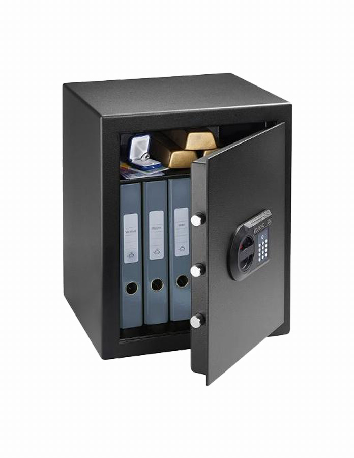 Coffre-fort à fixer Home-Safe • À double paroi • Matériau ignifugé selon DIN 4102-A1 • Rainure anti-feu • Verrouillage par pênes ronds rotatifs • Intérieur optimisé pour classeurs • Préparé pour fixation au mur et au sol, 2 perçages en diagonal au sol et au mur, avec accessoires de fixation