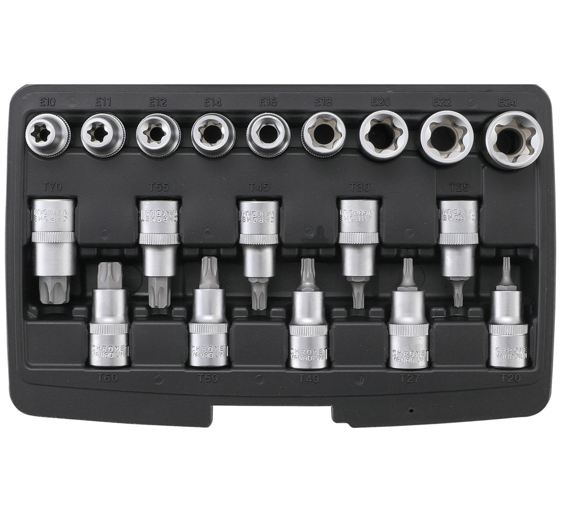 Assortiment de 19 pièces comprenant des douilles torx m les et femelles (6 pans) de 55 mm de longueur.