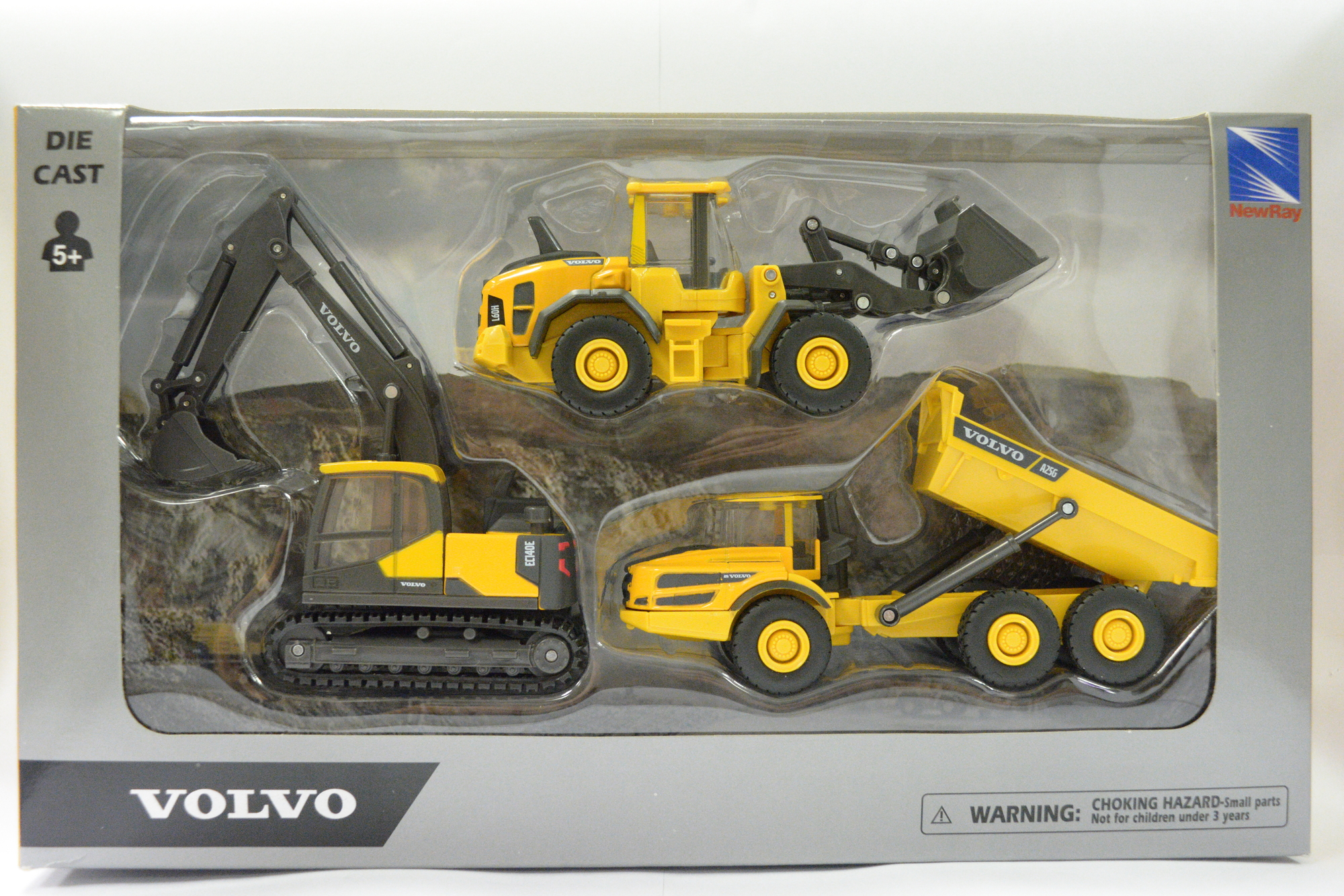 Coffret Volvo die-cast contenant 3 répliques officielles d'engins TP: pelleteuse EC140E, chargeur L60H, dumper A25G.