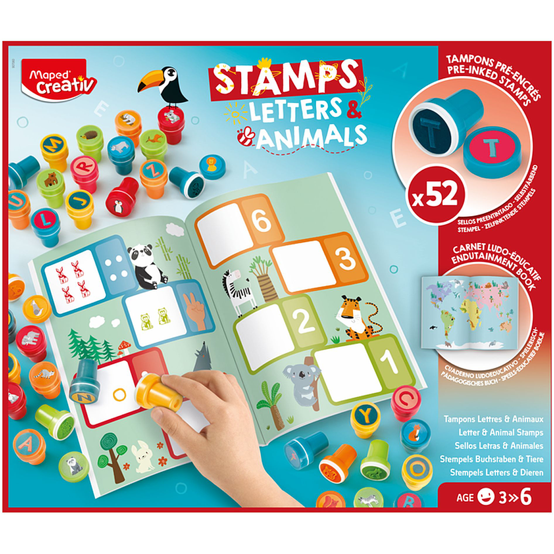 52 tampons sous le thème des lettres et des animaux pour compléter son livret ludo-éducatif, pour enrichir ses dessins ou tout simplement pour s'exprimer autrement.