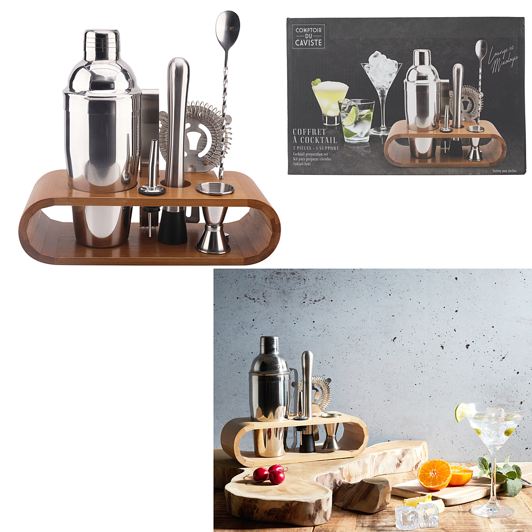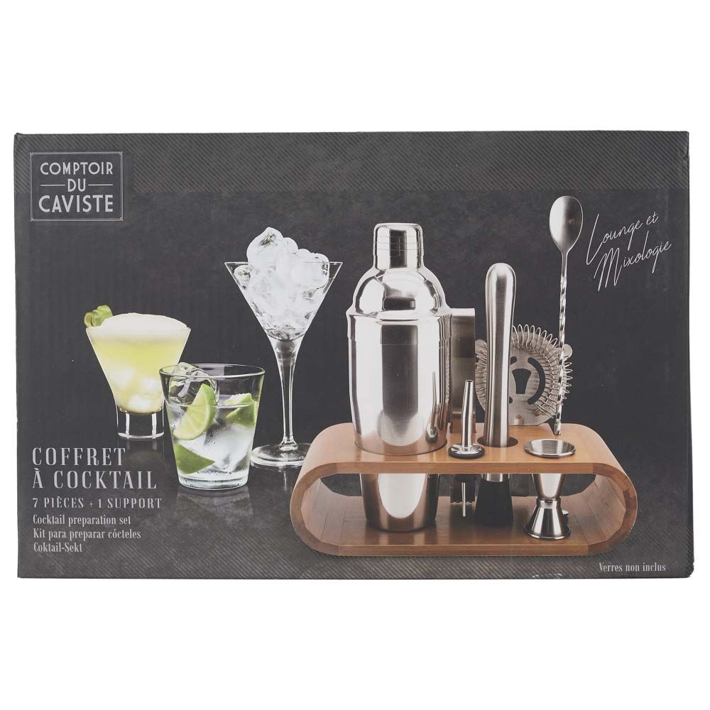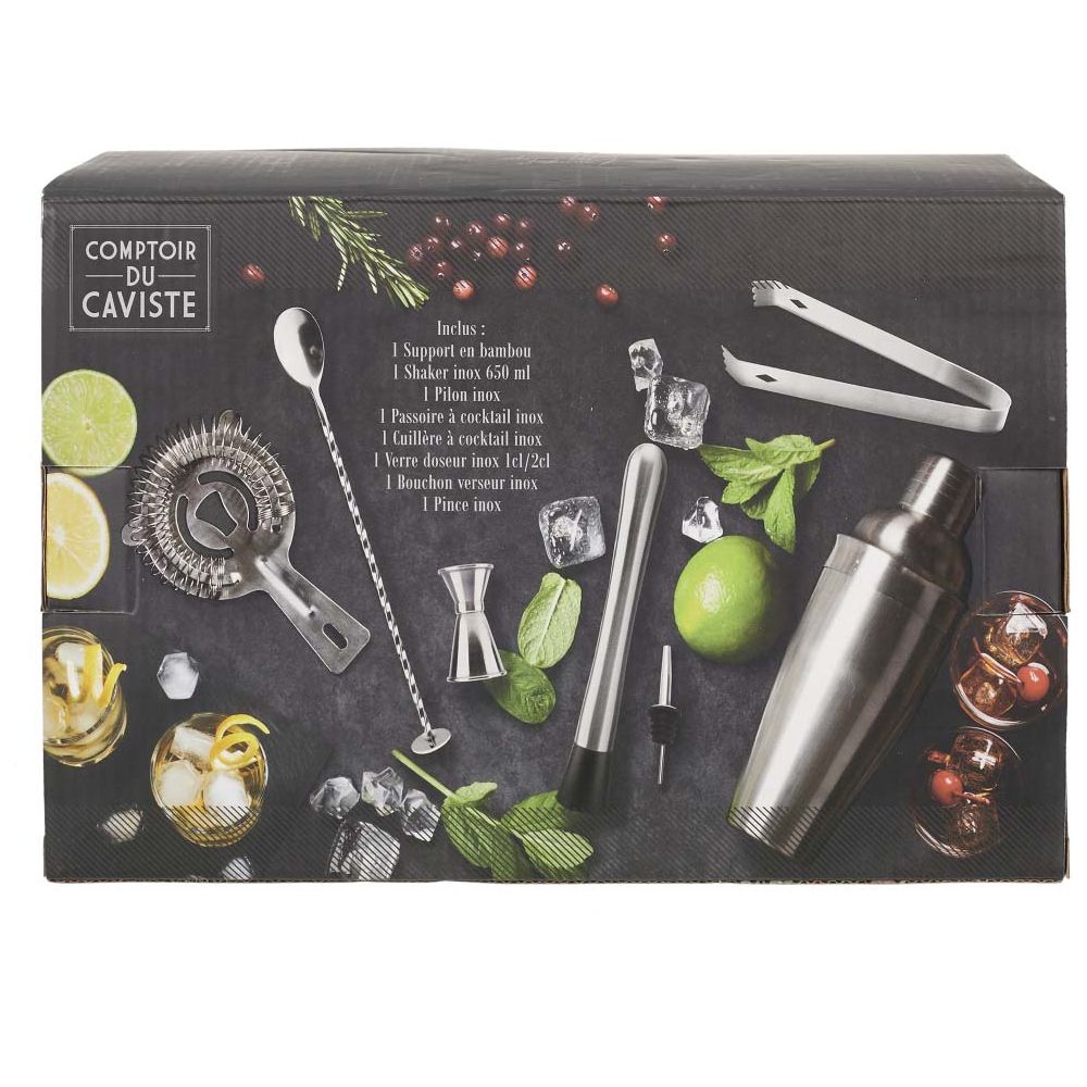 Ce coffret à cocktail fera le grand bonheur des amateurs de cocktail maison ! - Composition principale : Acier Inoxydable 1 support en bambou 1 shaker inox 650ml Contient : 1 pilon en inox, 1 passoire à cocktail, 1 verre doseur en inox 1cl, 1 bouchon verseur inox, 1 pince inoxx Optez pour un matériau durable ! Composition principale : acier inoxydable