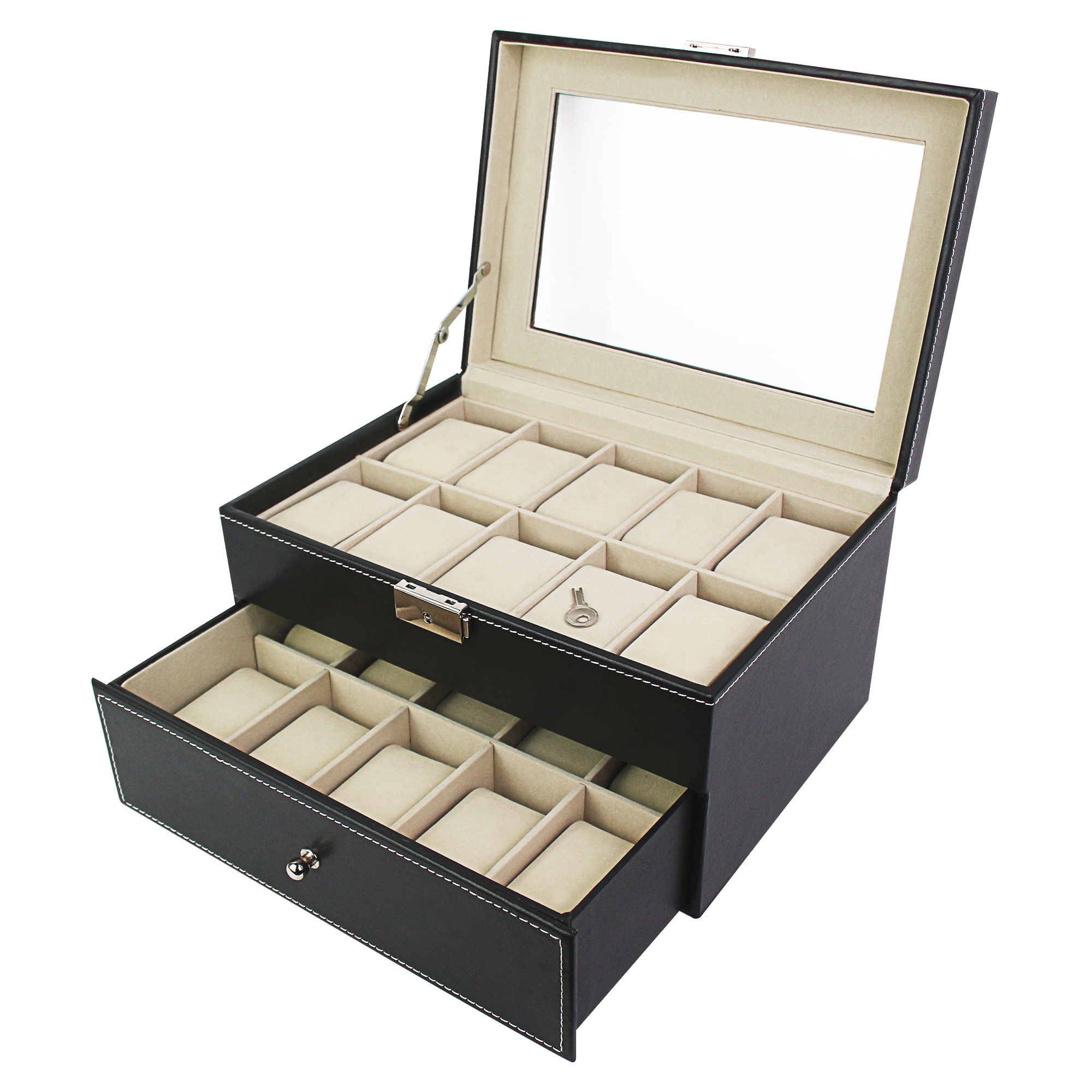 Coffret à Montres, Boite pour Montres et Bracelets, 20 montres avec vitre et tiroir, Noir/Beige, Dimensio