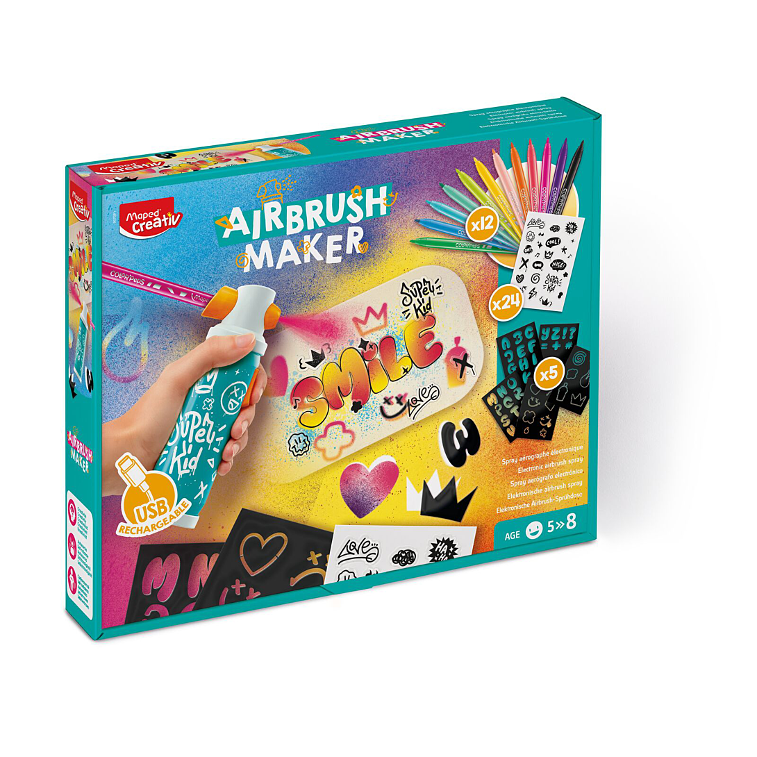 Coffret airbrush pour une activité complète de graff. Facile d'utilisation, il suffit de connecter un feutre et d'appuyer sur le bouton
