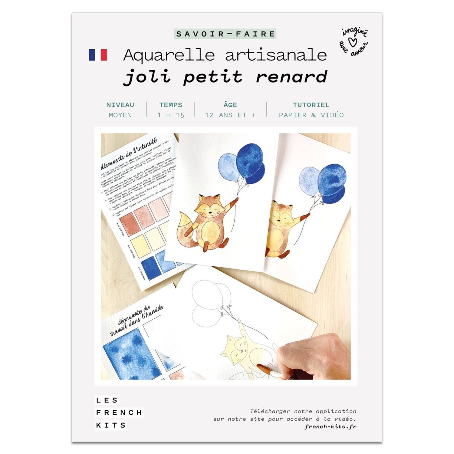 Réaliser un dessin enfantin avec un petit renard tenant des ballons avec ce kit Aquarelle artisanale 'Joli Petit Renard'. Créez votre première aquarelle en vous initiant à la technique de l'humide. Grâce à notre méthode progressive pour apprendre l'aquarelle, réalisez avec facilité votre première création. Dans le kit, un nuancier pour vous familiariser à l'intensité des couleurs, et des exercices pour vous entraîner. Ainsi, vous apprenez l'aquarelle facilement en travaillant une technique spécifique. Avec notre méthode, vous n'avez pas besoin de savoir dessiner. Dans le kit créatif se trouvent 3 papiers aquarelle imprimés avec le motif à représenter. Ils vous permettent de maîtriser le rendu de la peinture à l'eau petit à petit. En effet, les contours de l'esquisse vont du noir au gris très clair. Ainsi, le dessin final est quasi invisible et met en valeur la peinture. Ce kit aquarelle débutant contient : 3 couleurs d'aquarelle artisanales, 1 pinceau, 1 nuancier à compléter, 1 fiche d'exercices, 3 papiers aquarelles imprimés du plus foncé au plus clair, 1 livret technique papier, 1 accès au tutoriel vidéo. Dimensions du produit : 18 x 13 x 1,5 cm.