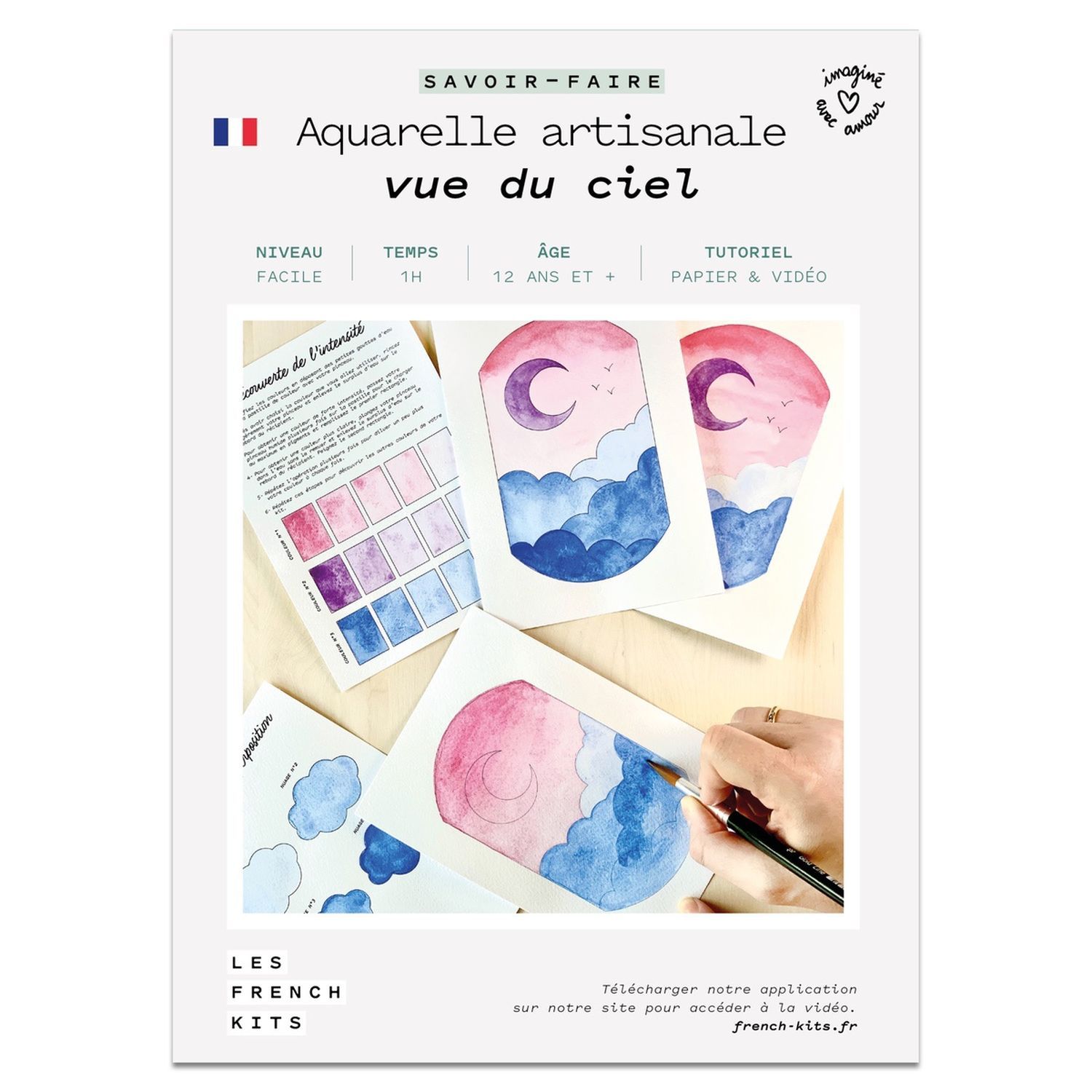 Réalisez un paysage de nuages et de Lune invitant à la rêverie grâce à ce kit Aquarelle artisanale 'Vue du ciel'. Créez votre première aquarelle en vous initiant à la technique de l'humide. Grâce à notre méthode progressive pour apprendre l'aquarelle, réalisez avec facilité votre première création. Dans le kit, un nuancier pour vous familiariser à l'intensité des couleurs, et des exercices pour vous entraîner. Ainsi, vous apprenez l'aquarelle facilement en travaillant une technique spécifique. Avec notre méthode, vous n'avez pas besoin de savoir dessiner. Dans le kit créatif se trouvent 3 papiers aquarelle imprimés avec le motif à représenter. Ils vous permettent de maîtriser le rendu de la peinture à l'eau petit à petit. En effet, les contours de l'esquisse vont du noir au gris très clair. Ainsi, le dessin final est quasi invisible et met en valeur la peinture. Ce kit aquarelle débutant contient : 3 couleurs d'aquarelle artisanales, 1 pinceau, 1 nuancier à compléter, 1 fiche d'exercices, 3 papiers aquarelles imprimés du plus foncé au plus clair, 1 livret technique papier, 1 accès au tutoriel vidéo. Dimensions du produit : 18 x 13 x 1,5 cm.
