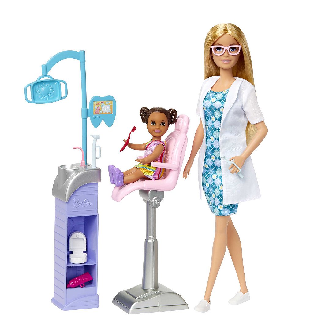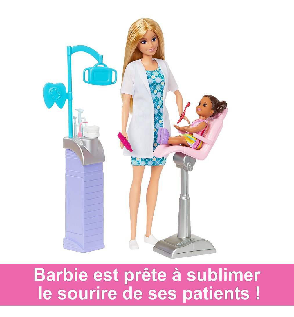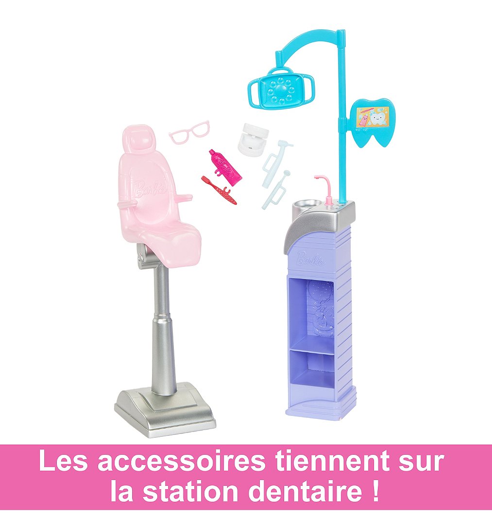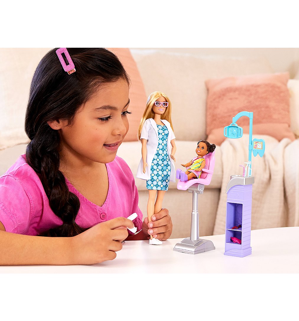 Barbie enseigne à sa petite patiente à bien se brosser les dents ! Barbie est incluse avec une fillette, du mobilier et des accessoires de soin.