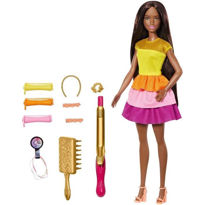 Ce coffret avec une poupée et neuf accessoires de coiffure facilitent la création de boucles et de torsades pour créer des styles personnalisés à Barbie.
