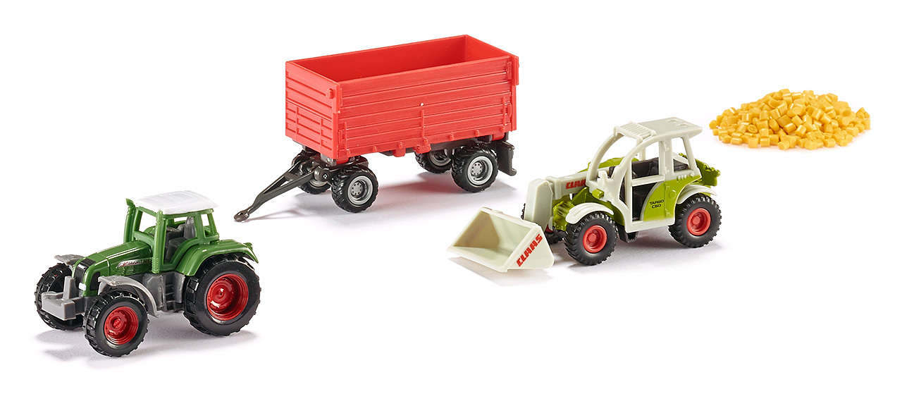 Transport et chargement du maïs dans un seul coffret cadeau. Le tracteur amène les granulés à la ferme avec la remorque où ils sont déversés. Le chargeur télescopique commence immédiatement à transborder le produit en vrac. La grande pelle et le bras télescopique sont utiles pour travailler rapidement.