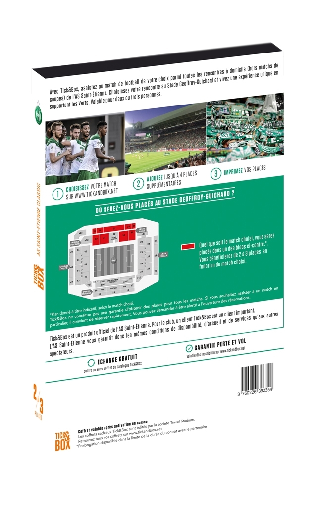 Une vue imprenable sur les deux Kops Stéphanois qui se répondent, ainsi que sur les 22 acteurs du jeu ? Une belle expérience Football à découvrir à Geoffroy-Guichard ! Ce coffret vous donne accès à 2 places pour un match de l’ASSE à domicile (hors matchs de coupes - certains matchs de Gala peuvent être soumis à supplément). Ajoutez des participants ou d'autres options en ligne et en quelques clics, depuis wonderbox-connect.com. Offrez un accès à plus de 100 partenaires d'exception et donnez-leur le choix parmi toute une sélection de matchs, de séjour, de parcs d'attractions, de spectacles ou encore de séances de cinéma. Ce coffret est valable 2 ans et 3 mois à partir de la date d'achat. Les matchs de Coupes ne sont pas inclus. Certains matchs de Gala peuvent être soumis à supplément. Ce placement est donné à titre indicatif, il peut évoluer sur certains matchs, d’une saison à l’autre et selon la politique tarifaire du club.