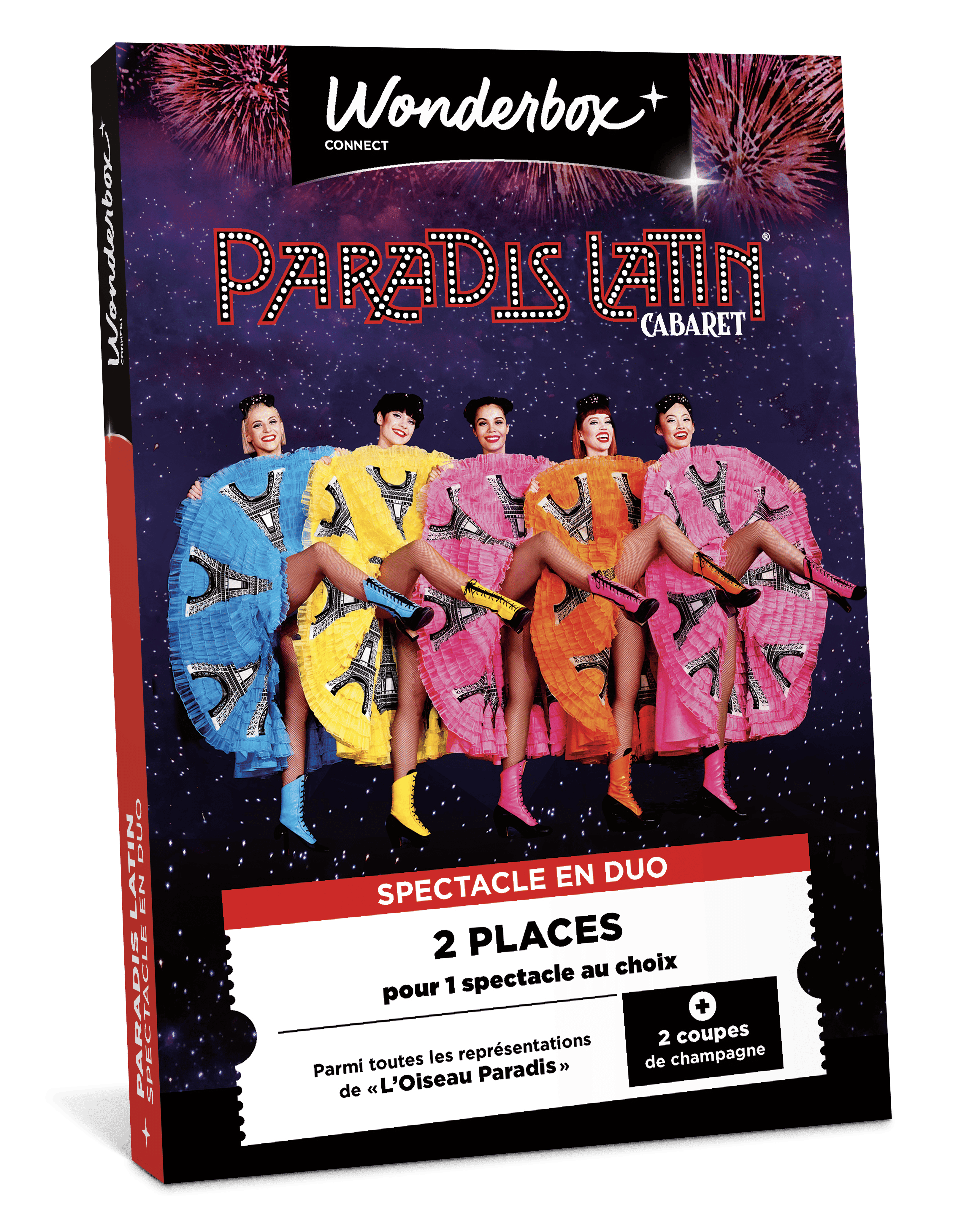 Bienvenue au Paradis Latin, cabaret mythique au cœur de Paris ! Depuis 2019, le Paradis Latin présente sa nouvelle revue « L’Oiseau Paradis » mise en scène et chorégraphiée par Kamel Ouali. Plongez dans un monde de glamour et de féerie et laissez-vous séduire par des performances captivantes, des costumes somptueux et une ambiance enivrante. Ce coffret vous permet de réserver 2 places pour 1 revue + 1 coupe de champagne par personne*. Planifiez votre représentation, ajoutez des participants ou d’autres options en ligne et en quelques clics, depuis wonderbox-connect.com. Offrez un accès à plus de 100 partenaires d'exception et donnez-leur le choix parmi toute une sélection de matchs, de séjours, de parcs d'attractions, de spectacles ou encore de séances de cinéma. Ce coffret est valable 2 ans et 3 mois à partir de la date d'achat. Wonderbox Connect est revendeur officiel du Paradis Latin. * : selon le calendrier du partenaire. Certains partenaires peuvent imposer un délai de réservation. Nous vous invitons à vous connecter sur wonderbox-connect.com pour consulter ce délai. Notre prix est déterminé en accord avec la politique tarifaire du partenaire au moment de la mise en vente du coffret. Si les tarifs du partenaire évoluent, la différence de prix pourra être facturée à l’utilisateur au moment de la réservation.