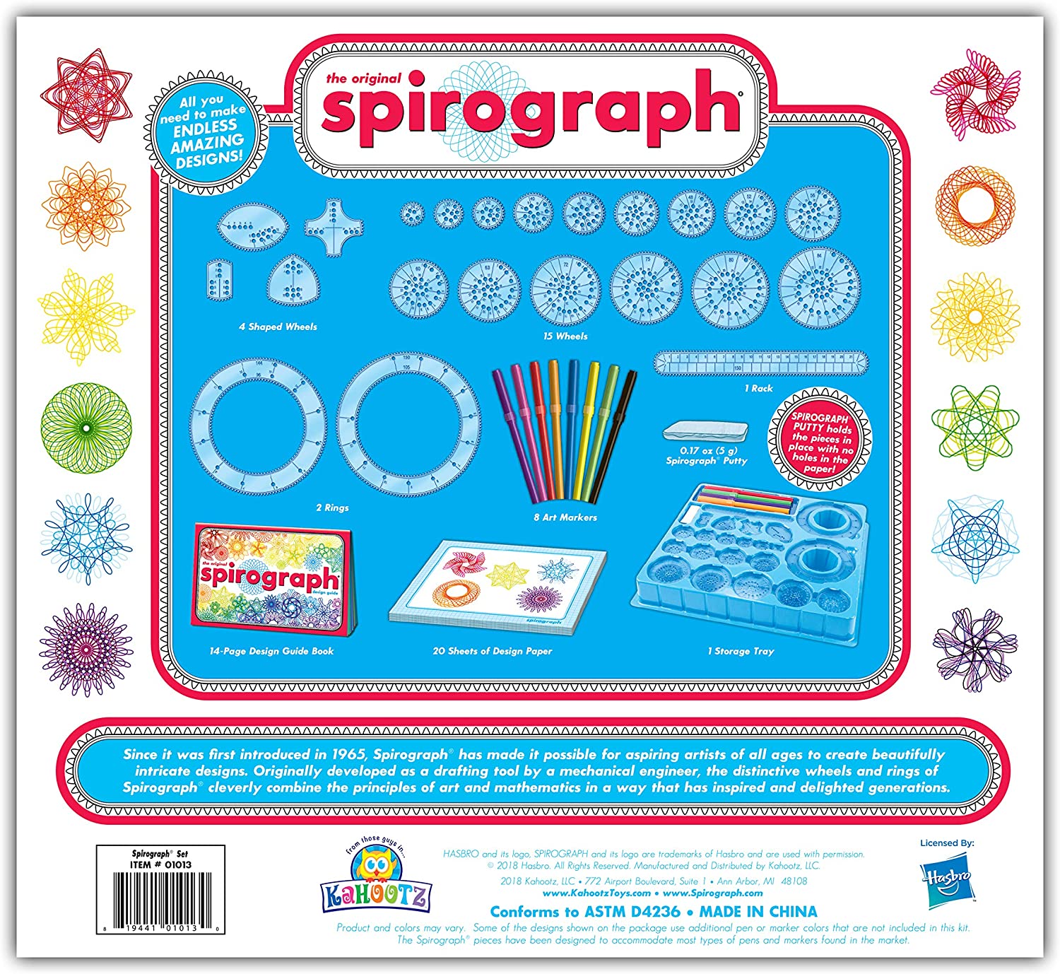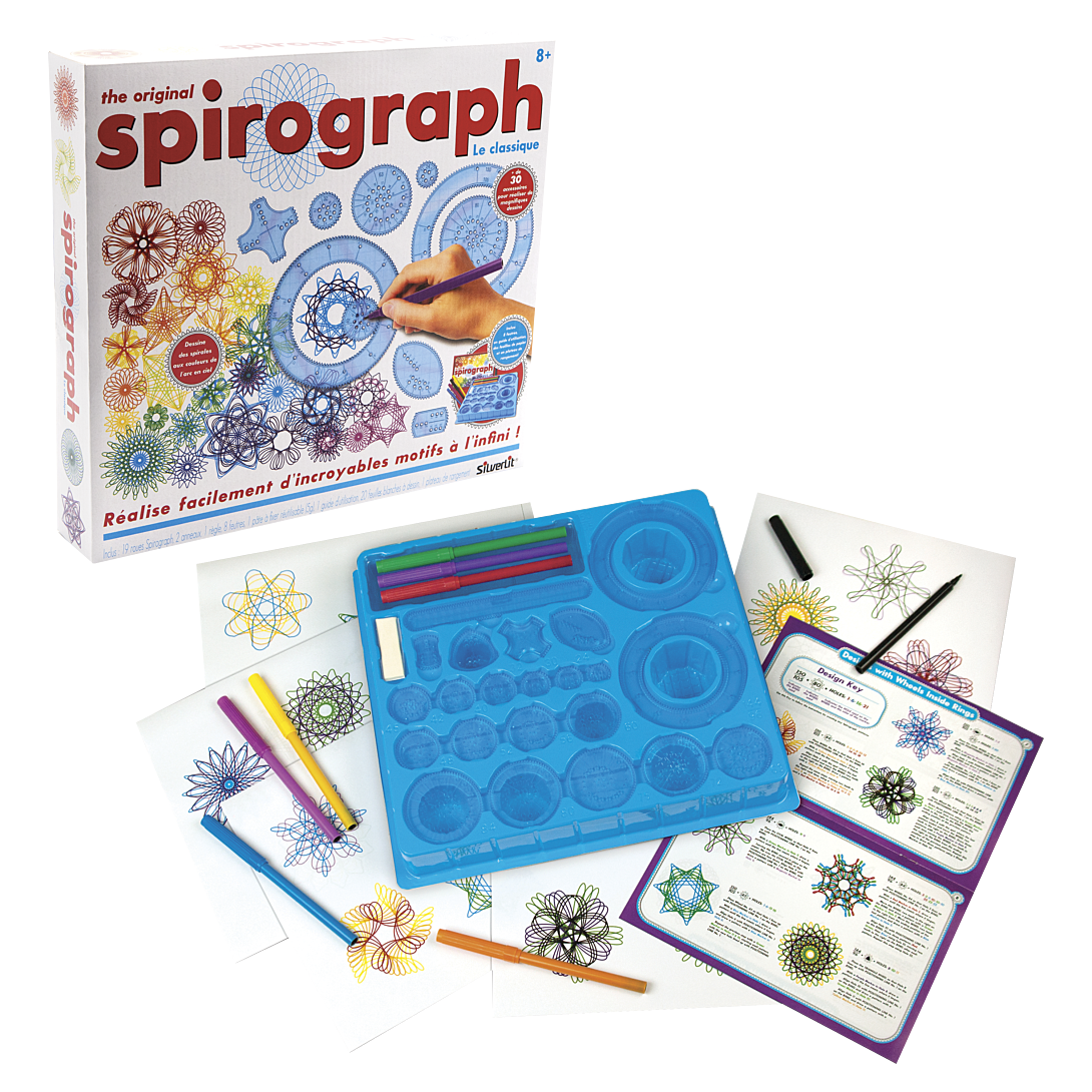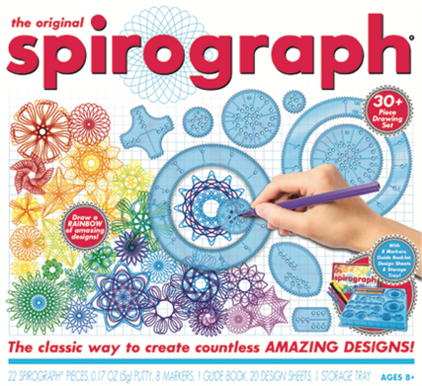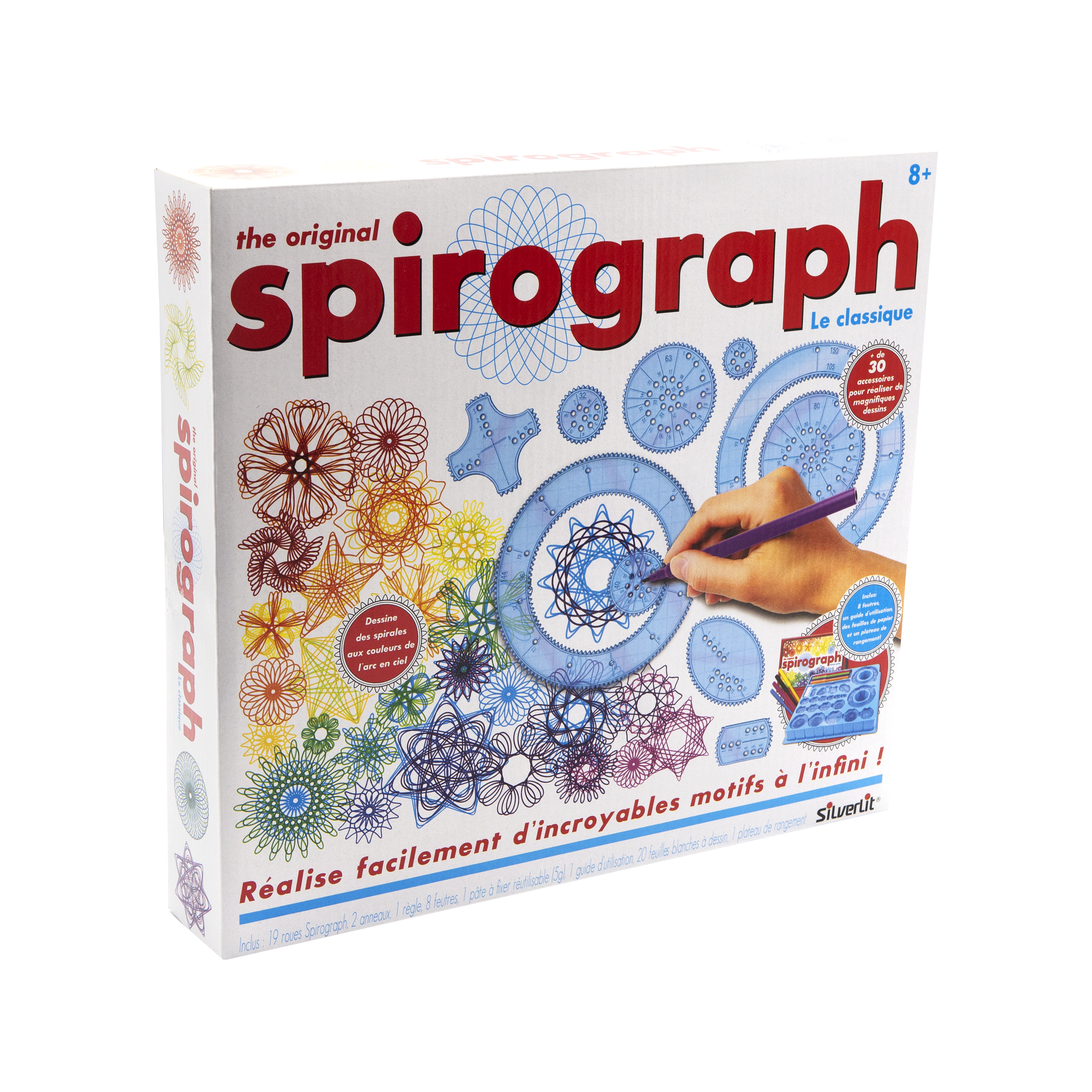 SPIROGRAPH Le coffret classique - set de démarrage 30 pièces incontournables Le classique Spirograph. Une combinaison d’art et de mathématiques! Créez d'innombrables dessins avec ce coffret spirographe. Contenu : 19 roues + 2 anneaux + 1 règle + 8 feutres + 1 guide de réalisation + + 20 feuilles de papier + 1 plateau de rangement Dès 8 ans.
