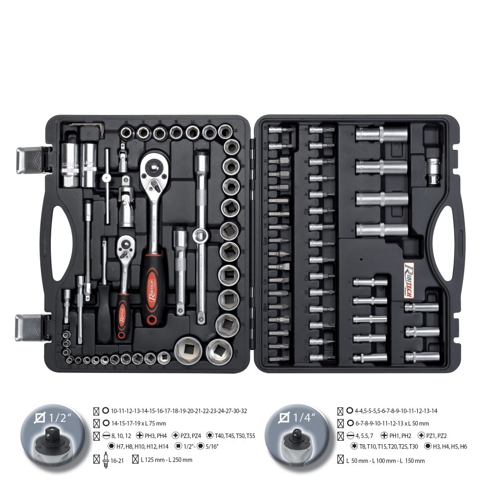 - Double format pratique: outils en 1/2" pour l'automobile et gros bricolage + outils en 1/4" pour travaux de précision