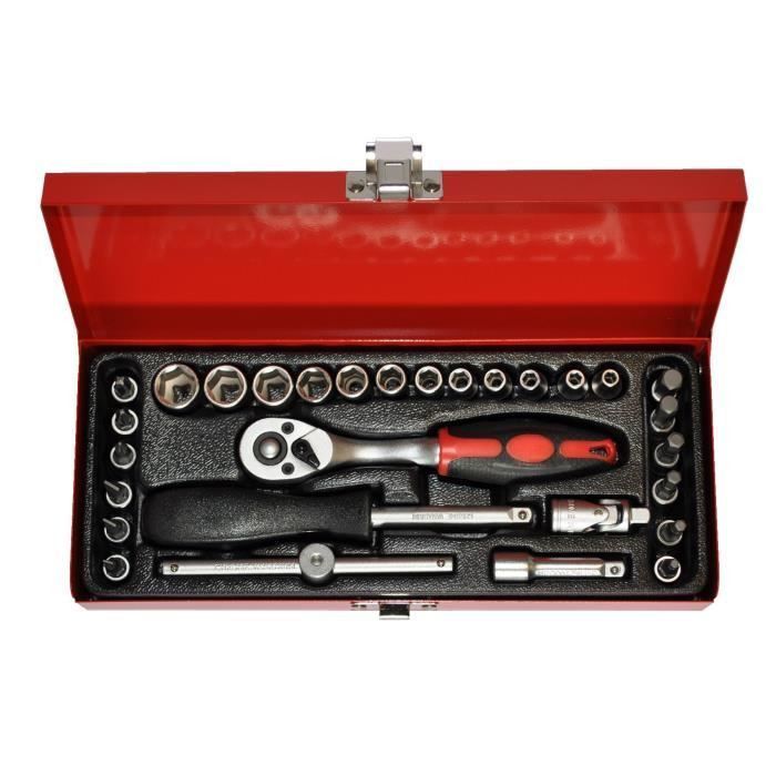 Composé de : 1 cliquet réversible, 1 poignée coulissante, 1 rallonge de 50 mm, 1 cardan universel, 1 manche, 12 douilles de 4 a 13 mm, 3 embouts de vissage cruciformes, 3 embouts de vissage plats, 6 embouts de vissage hexagonaux - En Chrome Vanadium type professionnel.