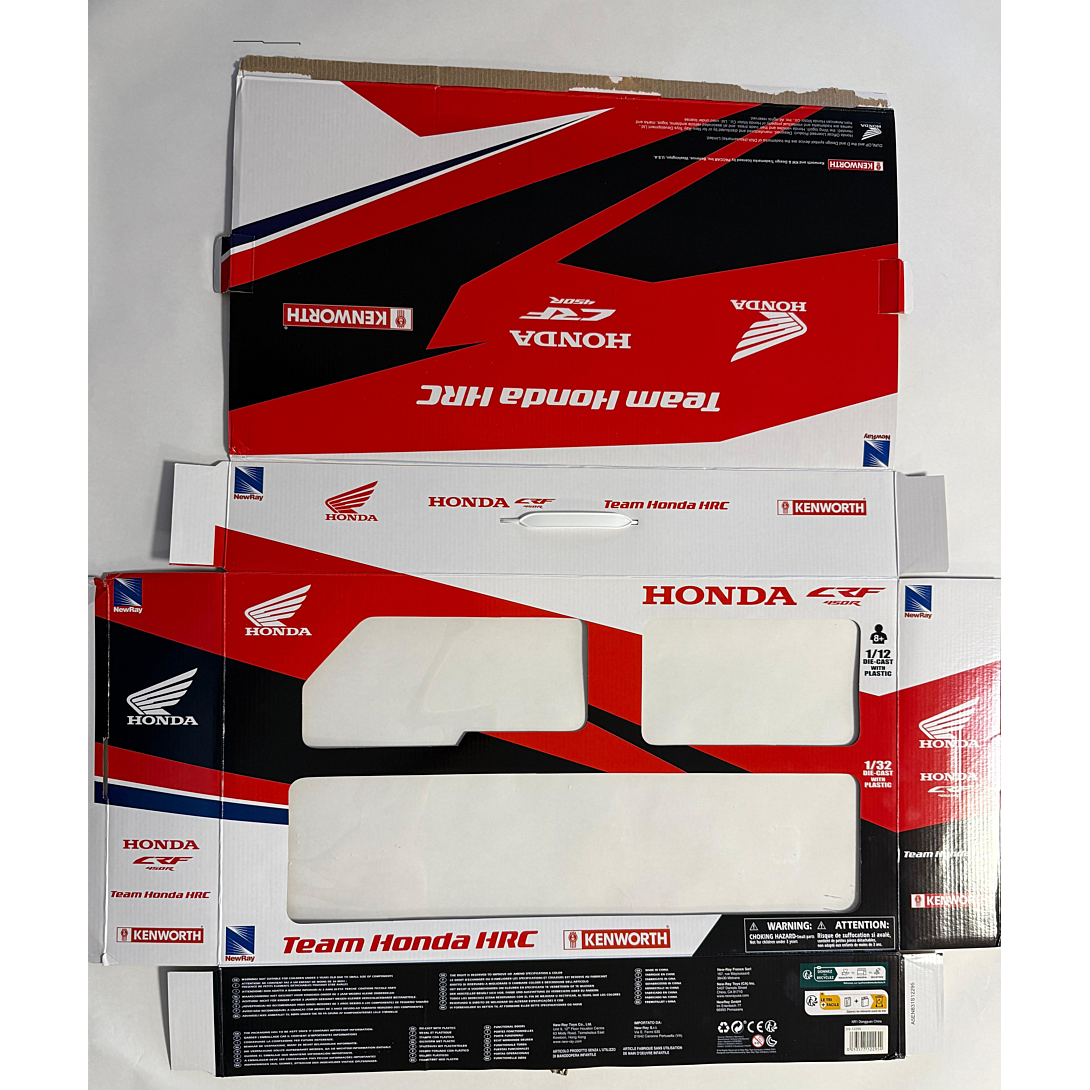 Pour les fans de moto-cross, un superbe coffret comprenant 1semi-remorque T700 Kenworth "Team Honda HRC Factory " - éch.1/32° et 1 moto cascadeur Honda éch.1/12° avec son pilote articulé. La moto et la cabine du camion sont en métal ( die cast).