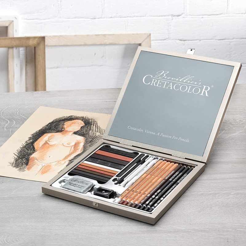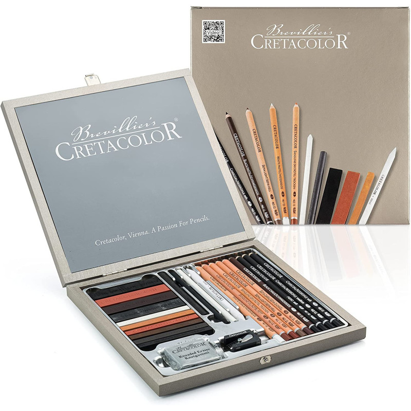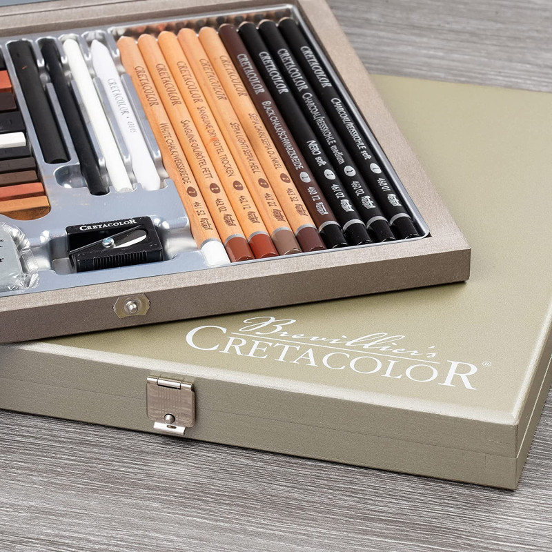 Coffret - Crayons beaux-arts - Fusain - Sanguine - Craie - Gomme - Taille-crayon - Cretacolor