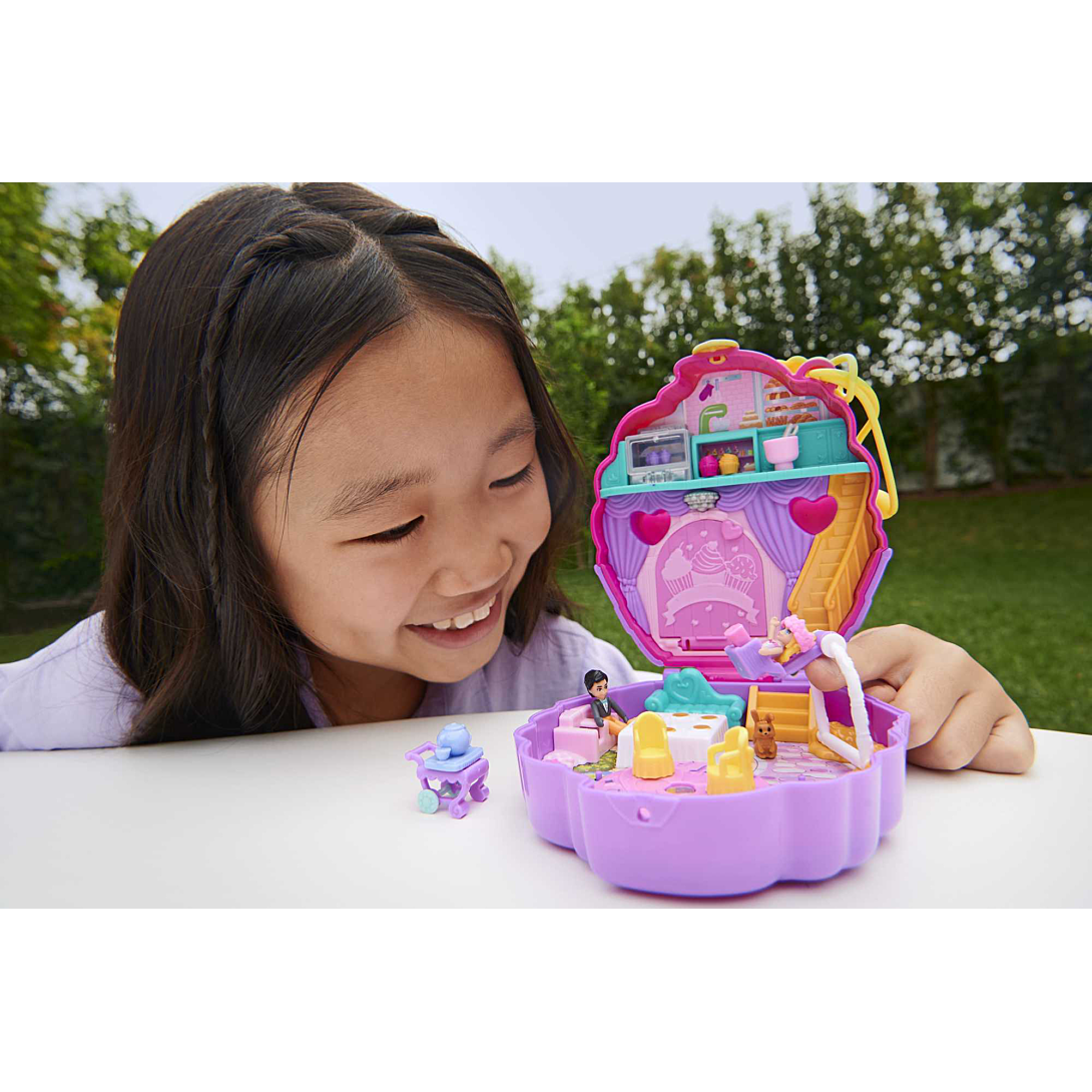 | Plus produit | Ce coffret Délicieux Cupcake de Polly Pocket prend la forme dune adorable figure de cupcake à lextérieur avec des joues déclencheuses pour samuser à linfini !\nLe jouet portable souvre pour dévoiler un décor parfaitement dans le thème, avec des mini-figurines de Polly et Jake Tam, 5 éléments mobiles et 13 accessoires, dont un lapin, 2 cupcakes, un chariot à thé qui roule vraiment et bien plus encore !\nOuvrez la porte de la boulangerie et mettez de délicieuses gourmandises à cuire dans le four, à moins que vous ne préfériez faire de la balançoire et danser sur lespace tournant... Il y en a pour tous les goûts !\nCertains des accessoires peuvent se clipper pour des possibilités de jeu infinies !\nUne dragonne permet aux enfants de transporter facilement les coffrets pour imaginer des aventures partout où ils vont !\nLe coffret Délicieux Cupcake de Polly Pocket offre une multitude de façons de jouer, ce qui en fait un cadeau idéal pour les enfants à partir de 4 ans, surtout sils sont gourmands ! |