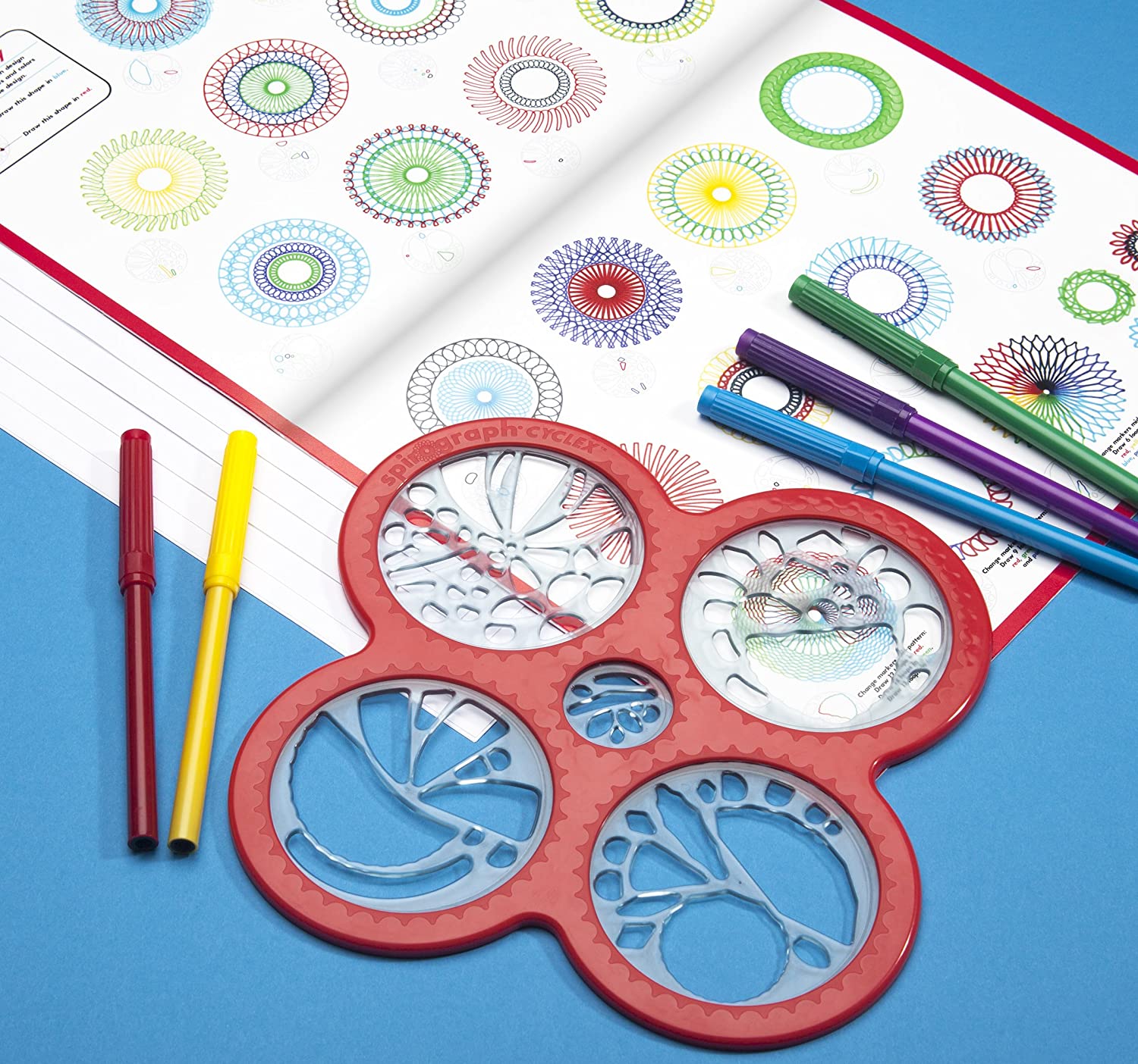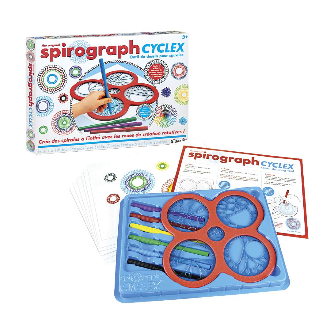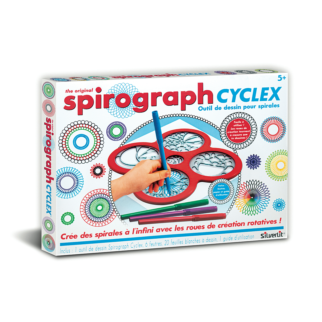 SPIROGRAPH Cyclex Création de spirales à l'infini avec les roues rotatives ! Contenu: 1 forme en plastique avec pochoirs intégrés (plus de 80 options de réalisation) + 6 feutres colorés + 1 guide de réalisation + 20 feuilles à dessin. Dès 5 ans