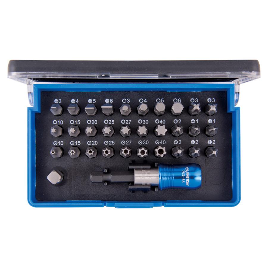 - Embouts Torx perçés, Résistorx (1x T10H, 1x T15H, 1x T20H, 1x T25H, 1x T30H, 1x T40H).