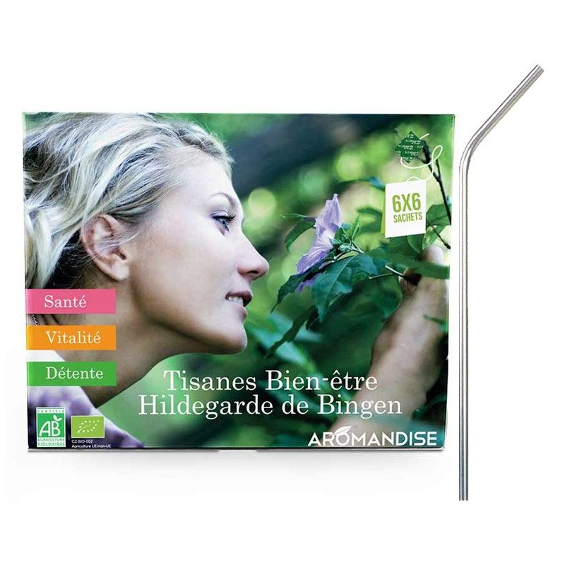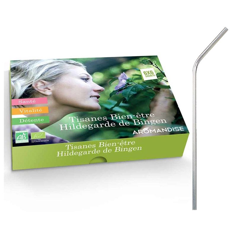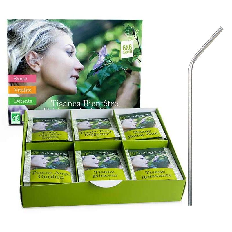 Le Coffret Découverte Tisane Hildegarde de Bingen propose une palette riche et variée de saveurs florales et fruitées. La gamme des Tisanes Hildegarde de Bingen, issues de l'agriculture biologique, profite des bienfaits des plantes médicinales tout en apportant détente, santé et vitalité alliant saveurs gourmandes ! Vous trouverez dans ce coffret 6 x 6 sachets issus de la gamme de tisanes Hildegarde de Bingen (Tisane Digestion Légère, Tisane Ange Gardien, Tisane Petit-Déjeuner, Tisane Minceur, Tisane Bonne Nuit, Tisane Relaxante). Mode de fabrication: Nettoyage, tri, séchage, coupe-réduction, mélange, emballage. . Les 4 pailles en acier inoxidable de 21 cm sont nettoyables facilement grâce à un goupillon de nettoyage avec une petite brosse. Elles permettent de préserver la nature et de ne pas jeter d'accessoires en papier ou en plastique.