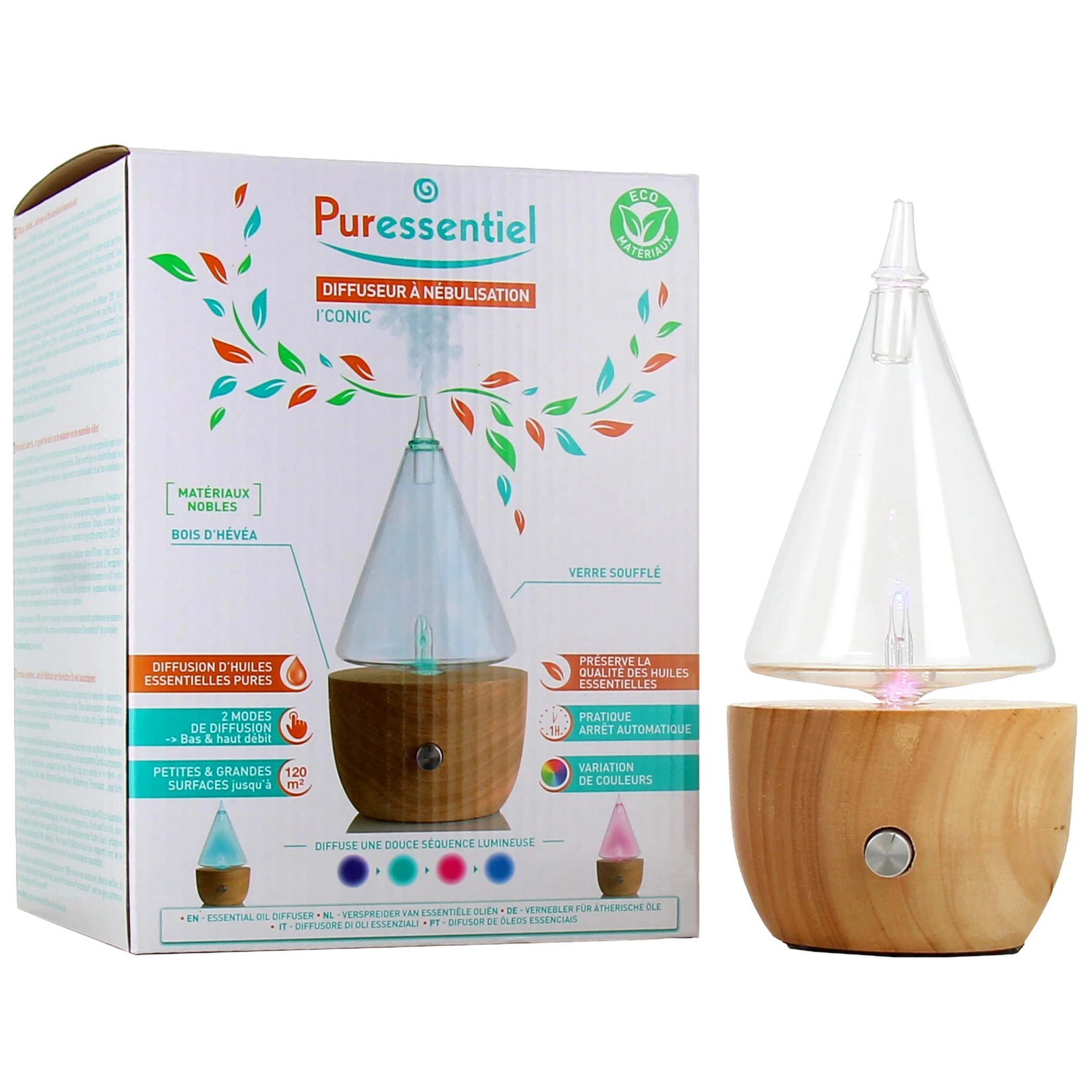 Ce diffuseur Puressentiel permet la diffusion d'huiles essentielles par nébulisation. Ce système de diffusion à froid, sans eau, disperse les huiles essentielles dans l'air sous forme de très fines particules. Il préserve les propriétés, les bienfaits et les qualités olfactives des huiles essentielles. Le diffuseur I'Conic Puressentiel fonctionne sur le principe de la diffusion alternée : 2 minutes de marche pour 1 minute de pause. La petite molette sur la face avant du diffuseur donne le choix entre 2 modes de diffusion à sélectionner selon la taille de la pièce. Ainsi, la position (I) correspond à un bas débit pour les pièces d'environ 60 m², tandis que la position (II) correspond à un haut débit pour les pièces allant de 100 à 120 m². La position (0), quant à elle, correspond à l'arrêt du diffuseur. A noter : le diffuseur Puressentiel I'Conic dispose d'une minuterie intégrée et s'arrête automatiquement 1 heure après le début de la diffusion. Silencieux et doté d'un design moderne et élégant, ce diffuseur à nébulisation est constitué de matériaux nobles : une verrine en verre soufflé repose sur un socle en bois d'hévéa. Enfin, une douce séquence lumineuse est diffusée sous le joint de support de la verrine lorsque le diffuseur est en fonction, renforçant ainsi la sensation de réconfort.