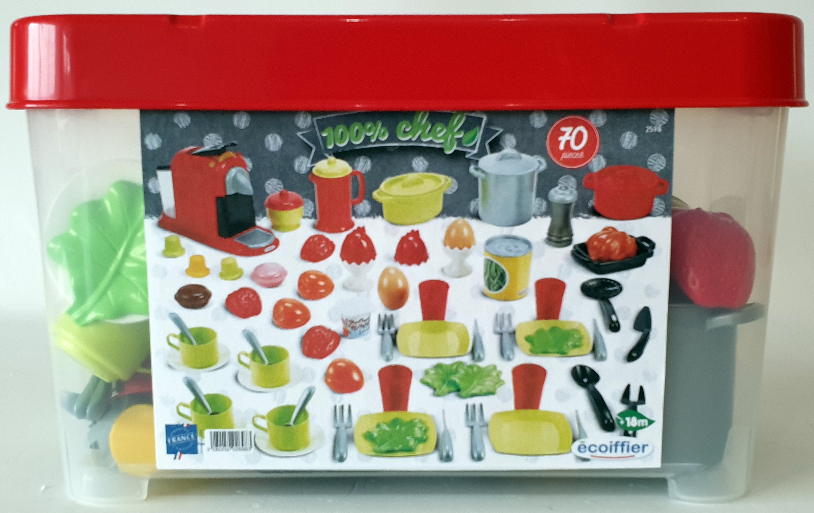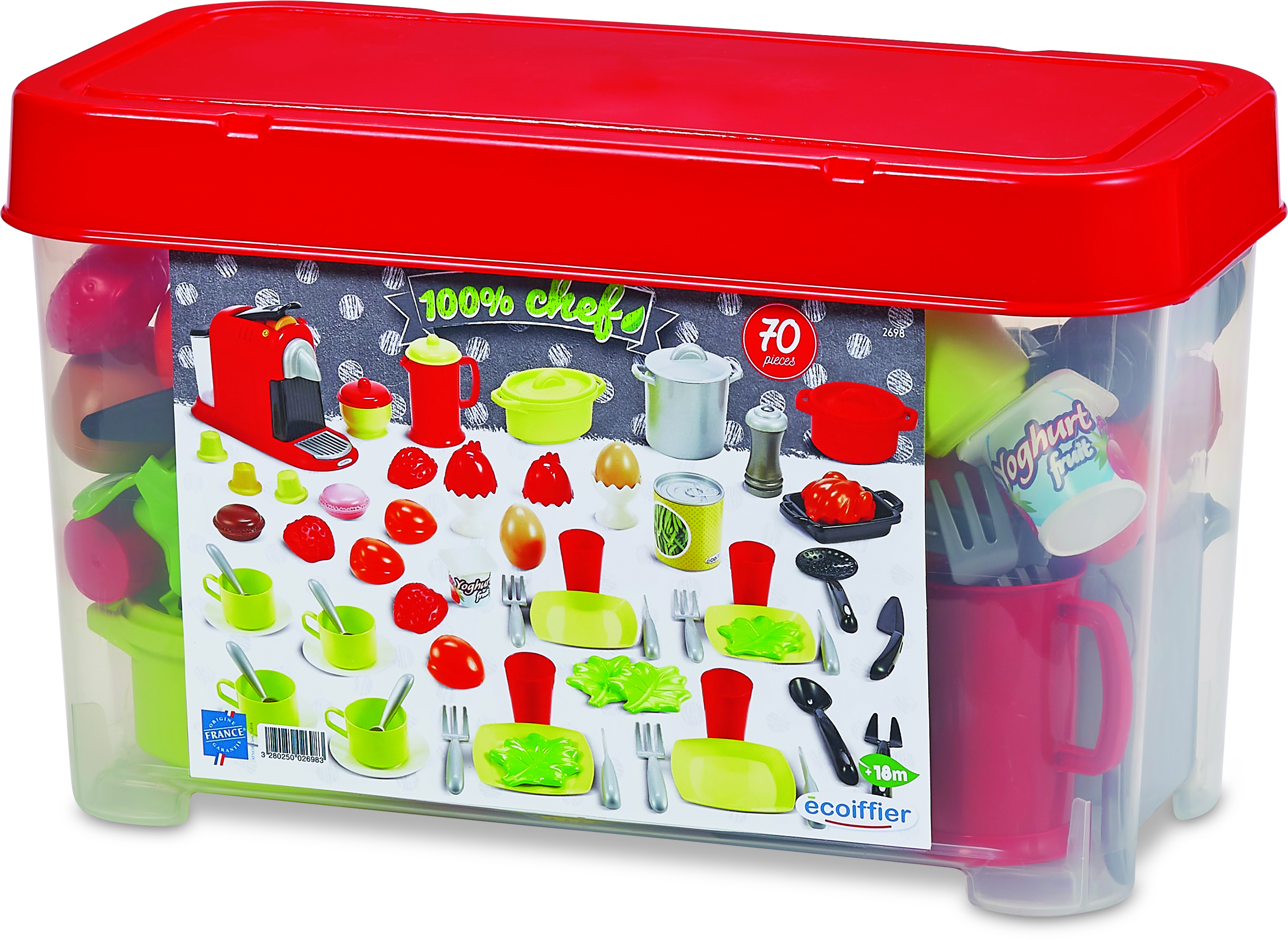70 accessoires de dinette dans ce baril solide et pratique pour le rangement. Conseillé dès 18 mois. Origine France Garantie.