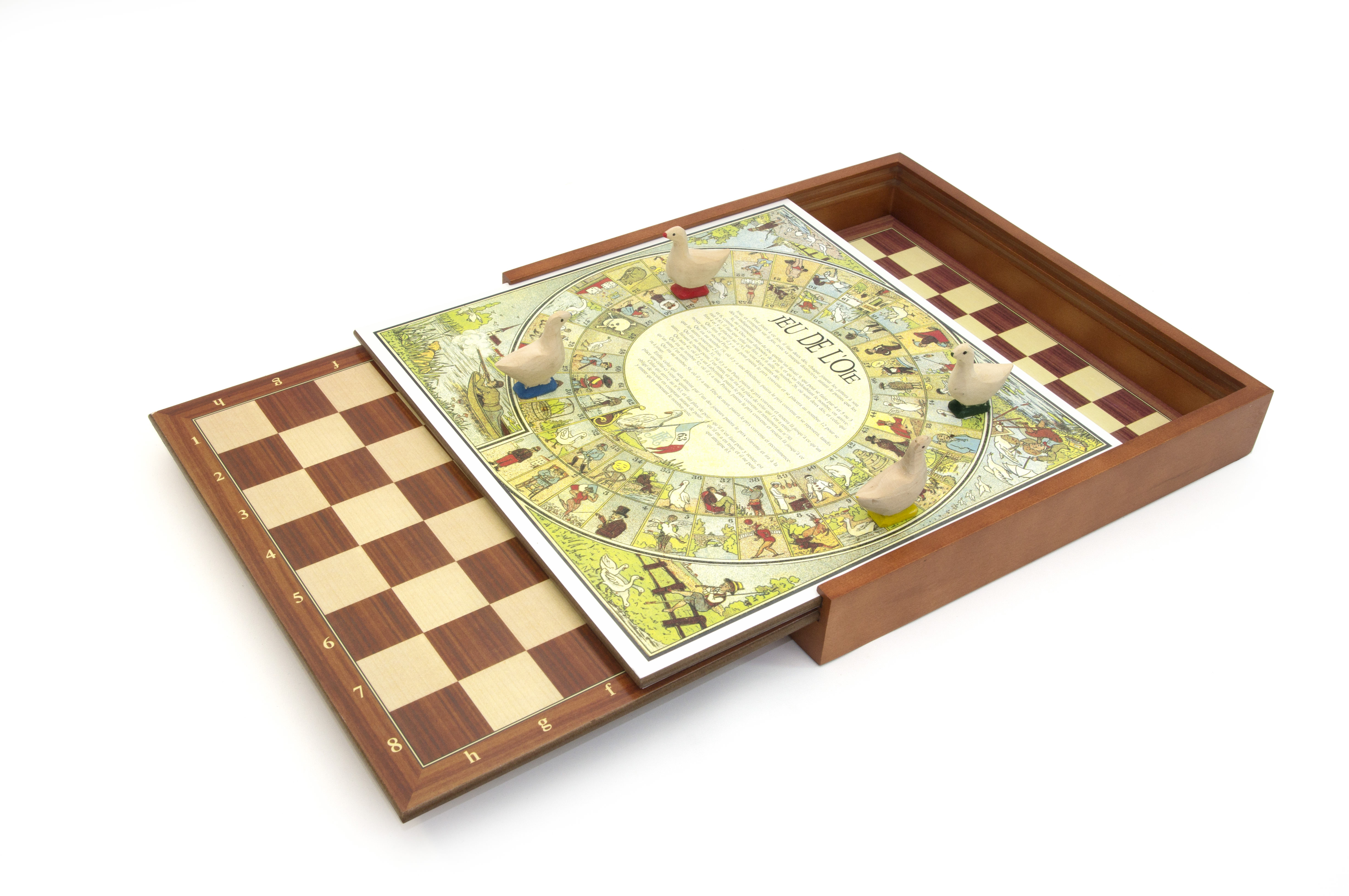 Coffret en bois de 5 jeux (plateaux + pièces + dés) : - Jeu de l’Oie - Petits Chevaux - Echecs - Backgammon - Dames