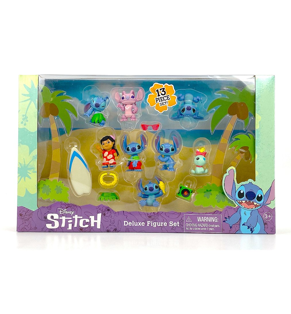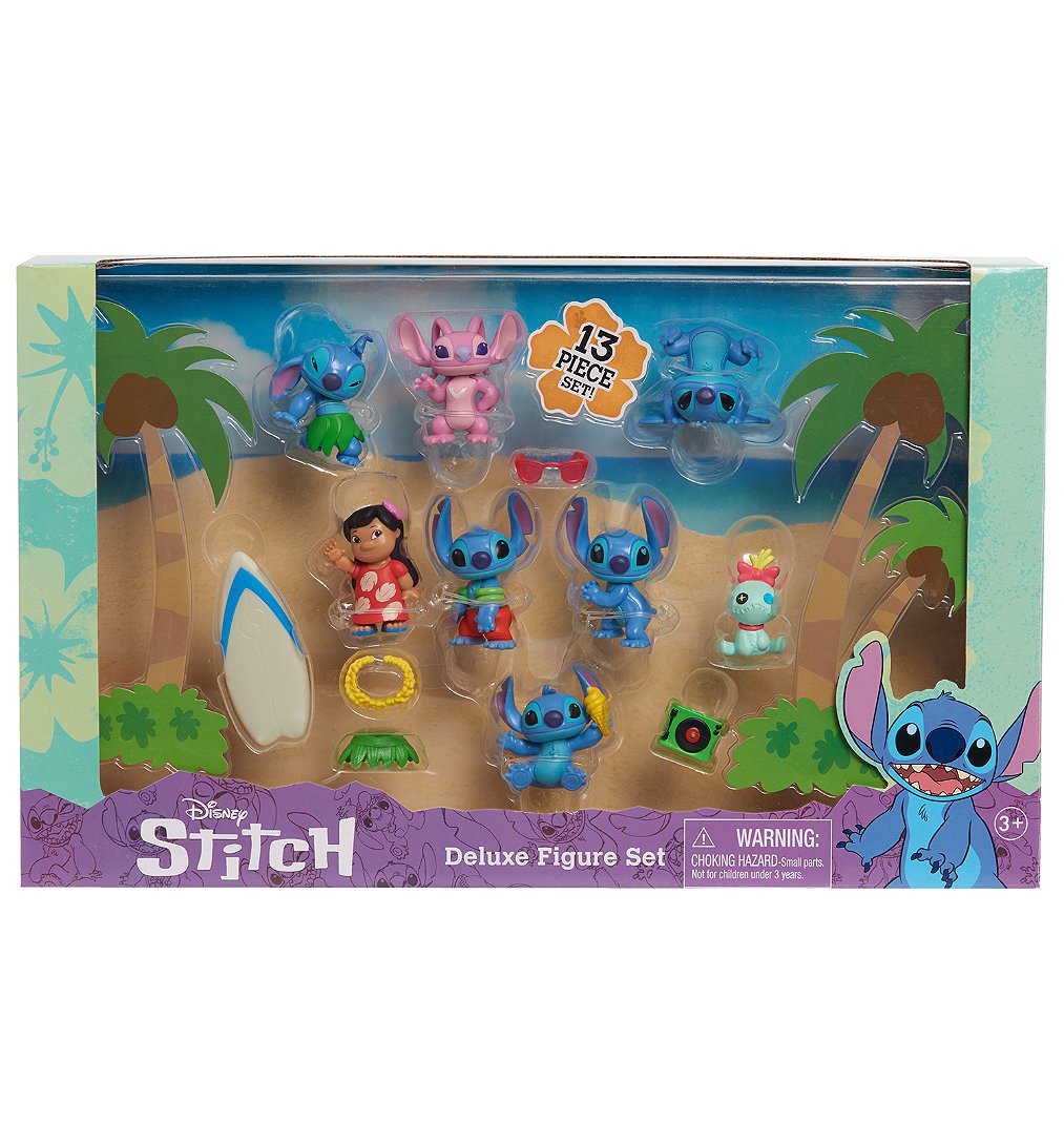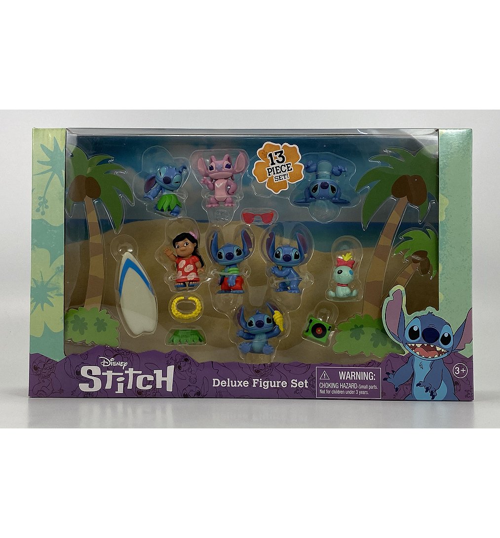 Coffret Deluxe de 13 pièces Lilo & Stitch. Contenu : 5x Stitch, 1x Lilo, 1x Scrump, 1x figurines Angel avec 1x planche de surf, 1x lei, 1x hula, 1x boîte à musique et 1x lunettes de soleil Dimensions : 5H cm