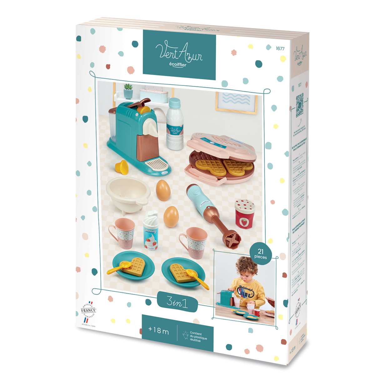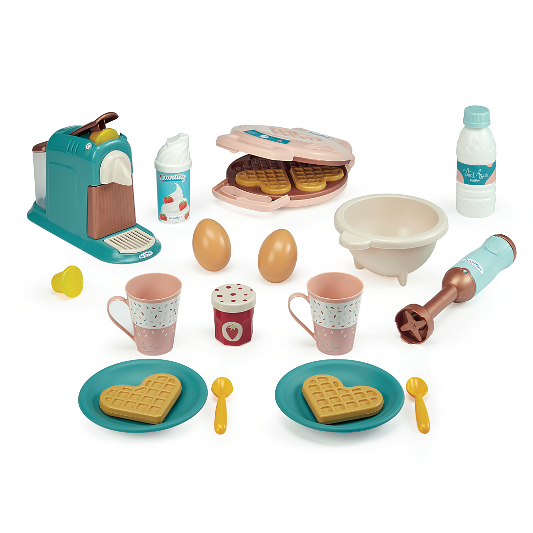 Ensemble pour la préparation du goûter comprenant 1 gaufrier avec 4 gaufres, 1 bol, 1 mixeur plongeant, 2 œufs, 1 cafetière avec 2 capsules et 2 tasses, 1 bouteille de lait, 1 bombe de chantilly et 1 pot de confiture. Dès 18 mois. Origine France Garantie.