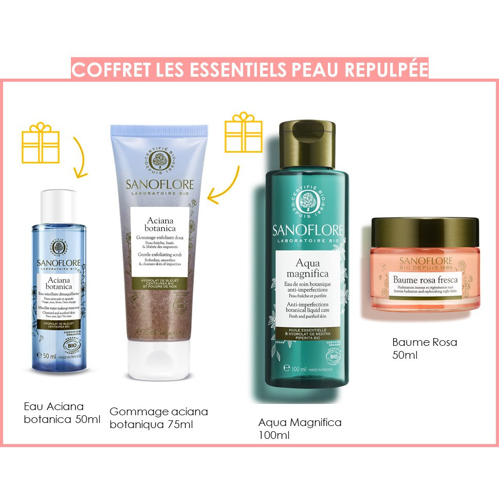 Coffret Mes essentiels certifiés bio, 98% origine naturelle, pour une peau repulpée, purifiée et lumineuse. OFFERT : Gommage Aciana botanica 75ml + Eau micellaire Aciana botanica 50 ml. Gommage Aciana botanica 75ml : 85% trouvent que leur peau est plus douce* 85% trouvent que la peau est plus fraîche* 83% trouvent que le produit enlève les peaux mortes* *Test consommateurs réalisé par 55 femmes de 21 à 57 ans. 50 % avec peau sensible, application 1 fois / jour sur visage, yeux et lèvres pendant 4 semaines. Aqua magnifica 100ml : -39% de comédons en 4 semaines* -60% d'imperfections* -20% de sébum* • Libère des impuretés • Oxygène la peau • Resserre les pores • Illumine *Tests cosméto-cliniques sous contrôle dermatologique (comptage des lésions et mesure instrumentale de la séborrhée). 53 femmes. Application de l'Aqua magnifica 2 fois par jour pendant 4 semaines. Baume Rosa fresca 50ml: La peau est plus hydratée tout au long de la journée : 97% trouvent que leur peau est intensément hydratée.