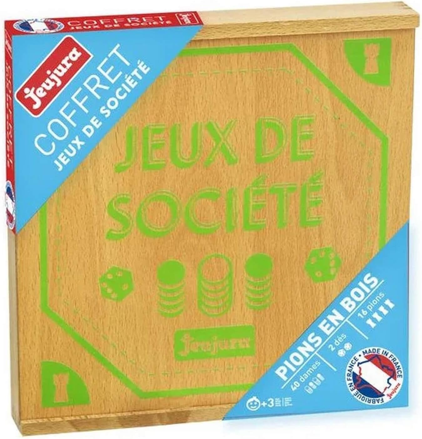 Un coffret jeux de société avec pions en bois : 16 pions, 40 dames, 2 dés.