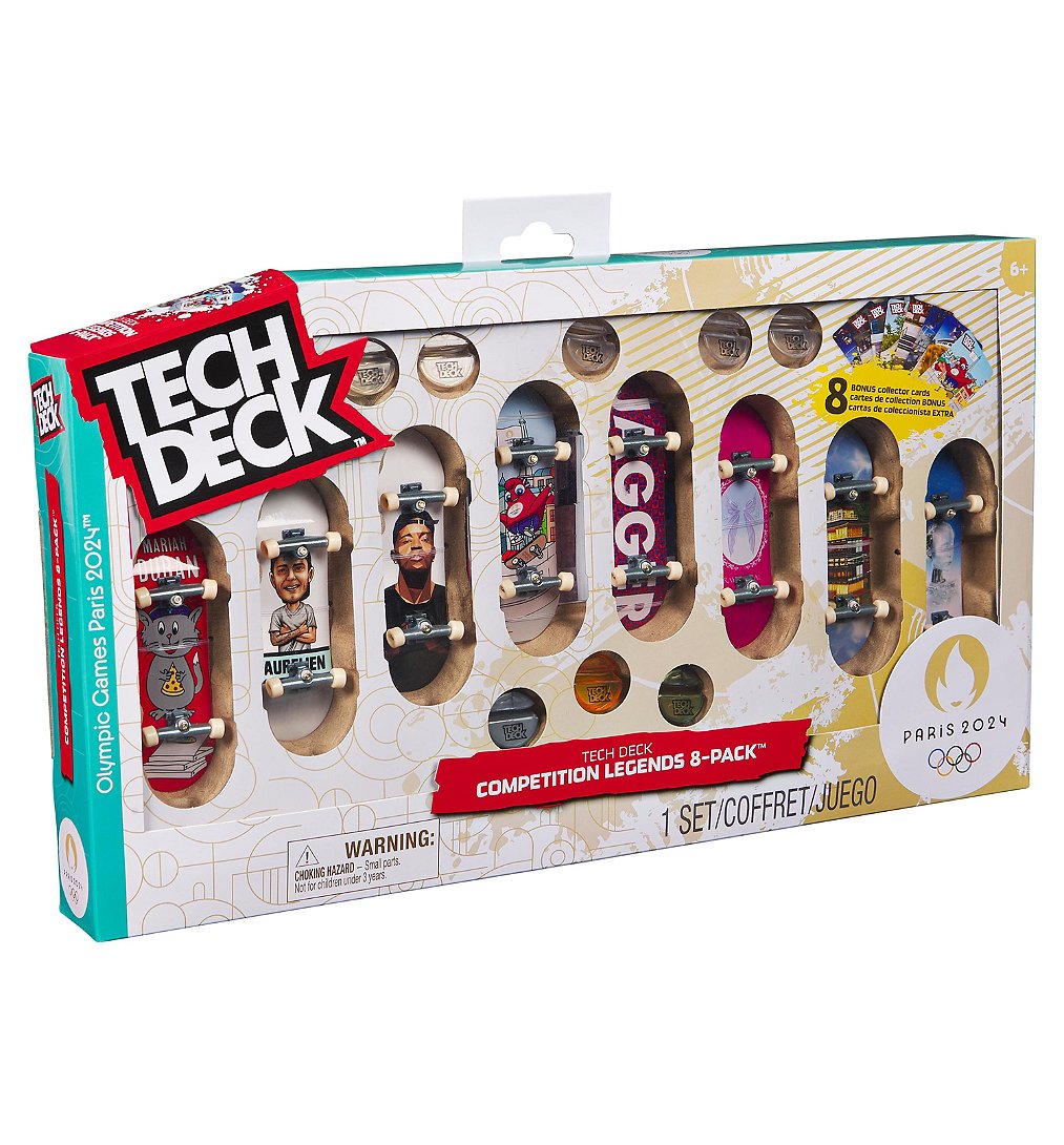 "Tech Deck : la marque numéro 1 des authentiques finger skates depuis 25 ans ! Un coffret spécial Jeux Olympiques 2024 regroupant 8 finger skates emblématiques à l'effigie de champions des équipes olympiques. Comprend 8 supports et 8 cartes à l'effigie de skateurs incluant des tricks à réaliser à l'aide de ses doigts. Planches sous licence officiel Paris 2024, Boîte fenêtre pegboardable. A partir de 6 ans."