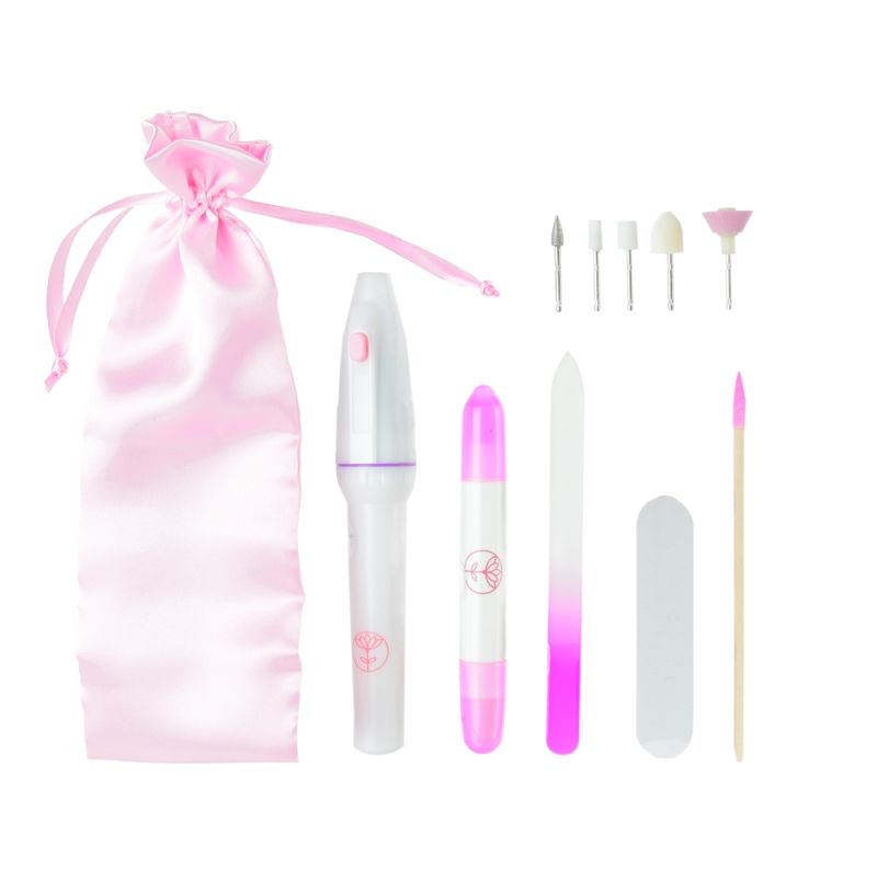 1 lime à ongles électrique + 1 kit de 5 embouts - 1 correcteur de vernis - 1 repousse cuticules - 1 lime à ongles en verre - 1 bloc polissoir 4 faces - 1 pochette satinée.