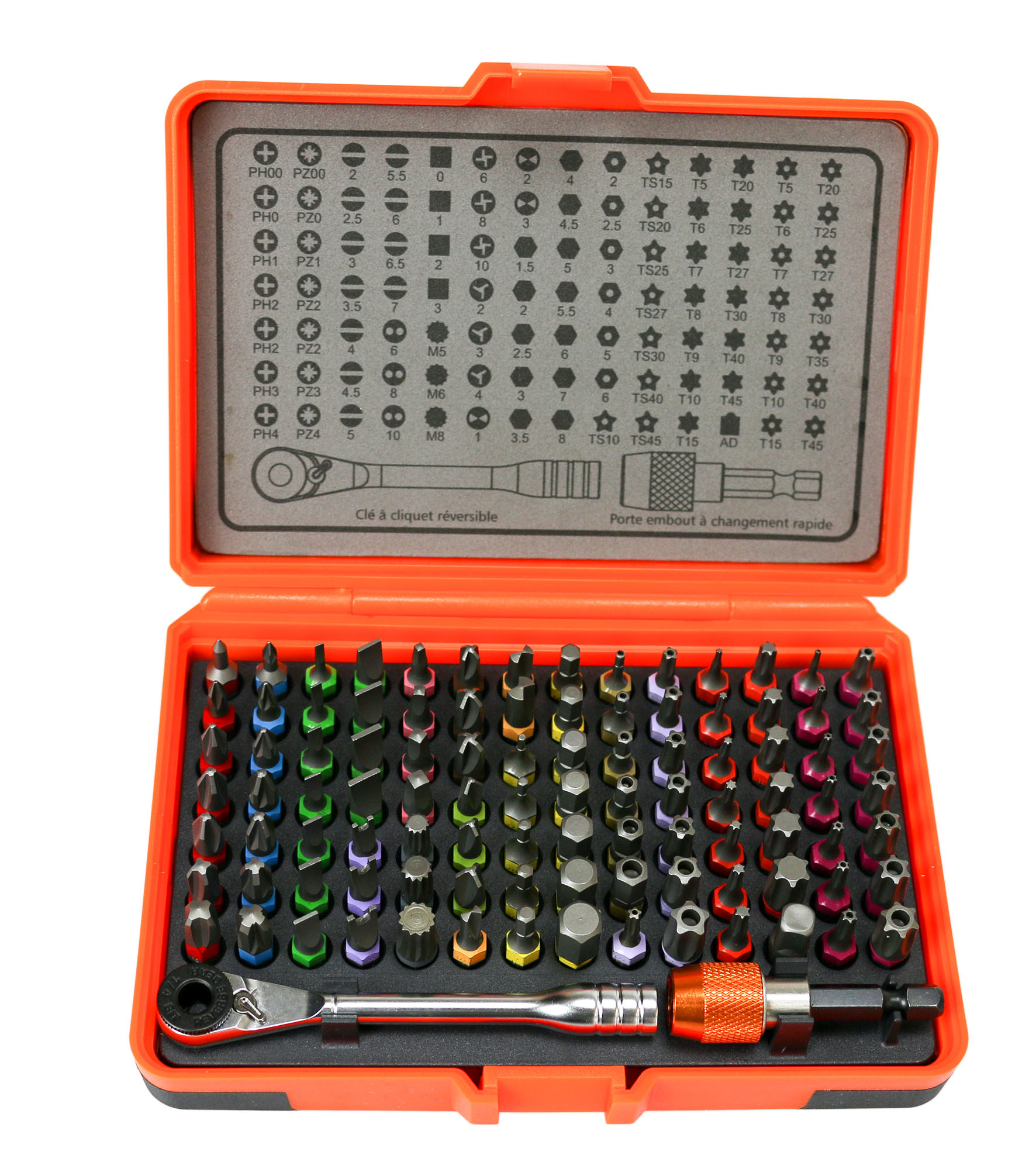 Optez pour notre coffret de vissage et serrage comprenant une mini clé à cliquet réversible et 98 embouts de vissage idéal pour des fixations de précision sûres et efficaces. Parfait pour les bricoleurs et les professionnels car les embouts peuvent également être utilisés avec une visseuse grâce au porte-embout automatique fourni.