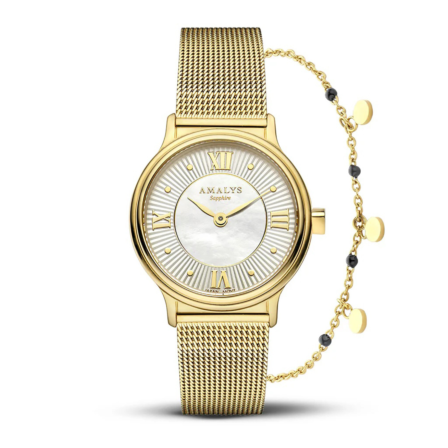 Le coffret Amandine d'Amalys est une option idéale pour un cadeau alliant sophistication et style. Il comprend une montre en acier inoxydable doré de 28 mm avec un mouvement à quartz japonais de haute précision et un verre saphir, garantissant une résistance durable. Accompagnée d'un élégant bracelet bijou assorti, cette montre offre une allure harmonieuse et moderne qui habillera parfaitement votre poignet en toutes occasions. En achetant ce coffret, vous contribuez également à une bonne cause : Amalys reverse 5 par vente à des associations soutenant les droits des femmes, telles que Think Pink et la Fondation des Femmes. De plus, le coffret Amandine bénéficie d'une garantie de 2 ans, avec une année supplémentaire offerte, pour un achat en toute tranquillité?.