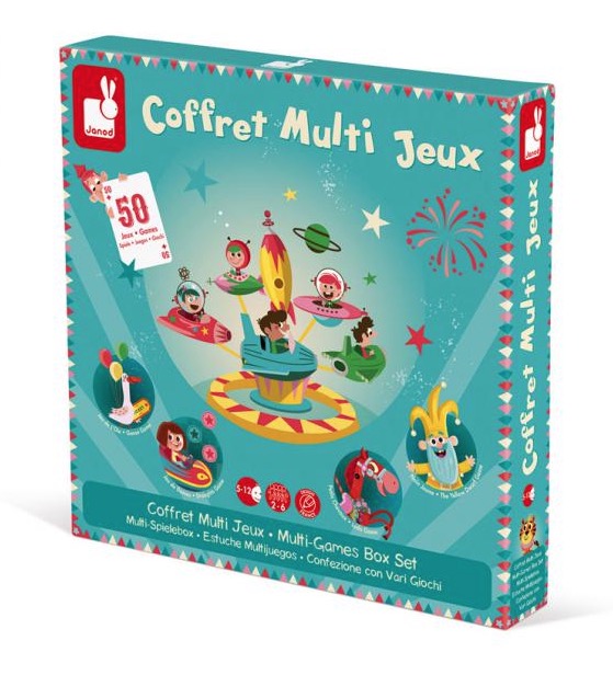 Coffret de jeux comprenant : 1 jeu de l’oie, 1 jeu de petits chevaux, 1 jeu de dames, 1 jeu de nain jaune, 1 jeu de 7 familles, 1 jeu de 54 cartes, 5 dés et un livret de 50 règles du jeu. Les pions des petits chevaux, jeu de l’oie, jeu de dames et des dés sont en bois massif. 50 jeux réunis dans un coffret sur la thématique de la fête foraine avec des jolies illustrations colorées ! Le coffret idéal pour des heures de jeu à partager en famille ou entre amis ! Les pions sont imprimés en transfert à chaud. Règles du jeu incluses en 3 langues (français, anglais, allemand). 2 à 6 joueurs. Boite cloche