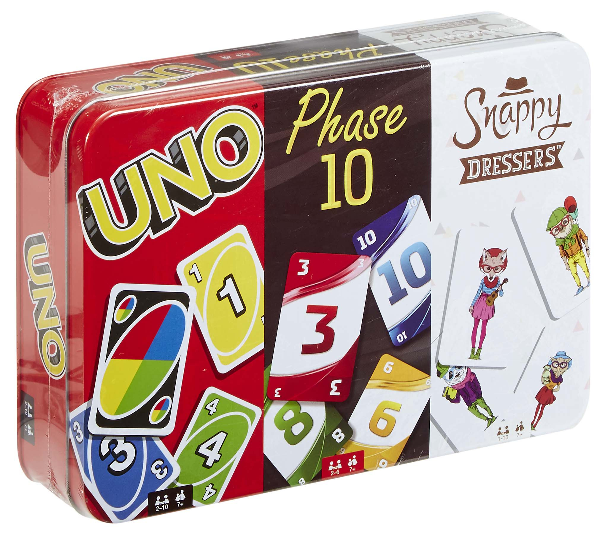 Voici le cadeau idéal pour tes amis fans de jeux de société : UNO, PHASE 10 et LES ANIMAUX EN FÊTE dans une boîte métallique collector ! Par quel jeu allez-vous commencer ? UNO : associe les couleurs et les chiffres pour être le premier joueur à se débarrasser de toutes ses cartes. PHASE 10 : les joueurs doivent poser des séries de cartes et être les premiers à réaliser 10 phases. LES ANIMAUX EN FÊTE : avec ces cartes colorées représentant des animaux en tenues originales, tu peux choisir entre 10 jeux d'association différents. Chaque carte comporte au moins une correspondance avec n'importe quelle autre carte. C'est la collection rêvée pour passer des soirées amusantes en famille ou entre amis. Réunis tes amis et enchaînez trois parties !
