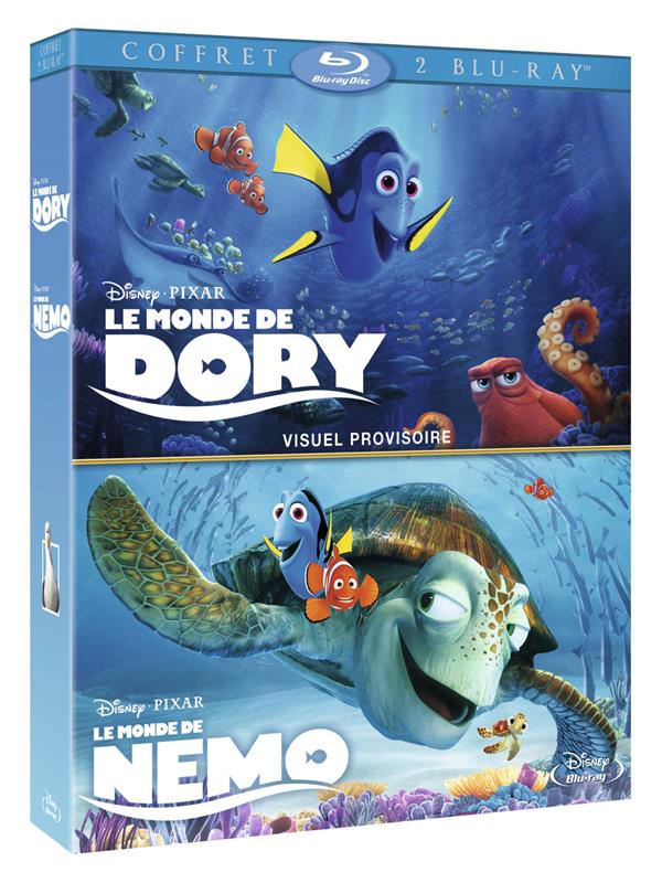 Le Monde de Nemo : Dans les eaux tropicales de la Grande Barrière de corail, un poisson-clown du nom de Marin mène une existence paisible avec son fils unique, Nemo. Redoutant l'océan et ses risques imprévisibles, il fait de son mieux pour protéger son fils. Comme tous les petits poissons de son âge, celui-ci rêve pourtant d'explorer les mystérieux récifs. Lorsque Nemo disparaît, Marin devient malgré lui le héros d'une quête unique et palpitante. Le pauvre papa ignore que son rejeton à écailles a été emmené jusque dans l'aquarium d'un dentiste. Marin ne s'engagera pas seul dans l'aventure : la jolie Dory, un poisson-chirurgien bleu à la mémoire défaillante et au grand coeur, va se révéler d'une aide précieuse. Les deux poissons vont affronter d'innombrables dangers, mais l'optimisme de Dory va pousser Marin à surmonter toutes ses peurs. Le Monde de Dory : Dans LE MONDE DE DORY, le nouveau film d'animation Disney-Pixar, Dory, le poisson chirurgien bleu amnésique, retrouve ses amis Nemo et Marlin.