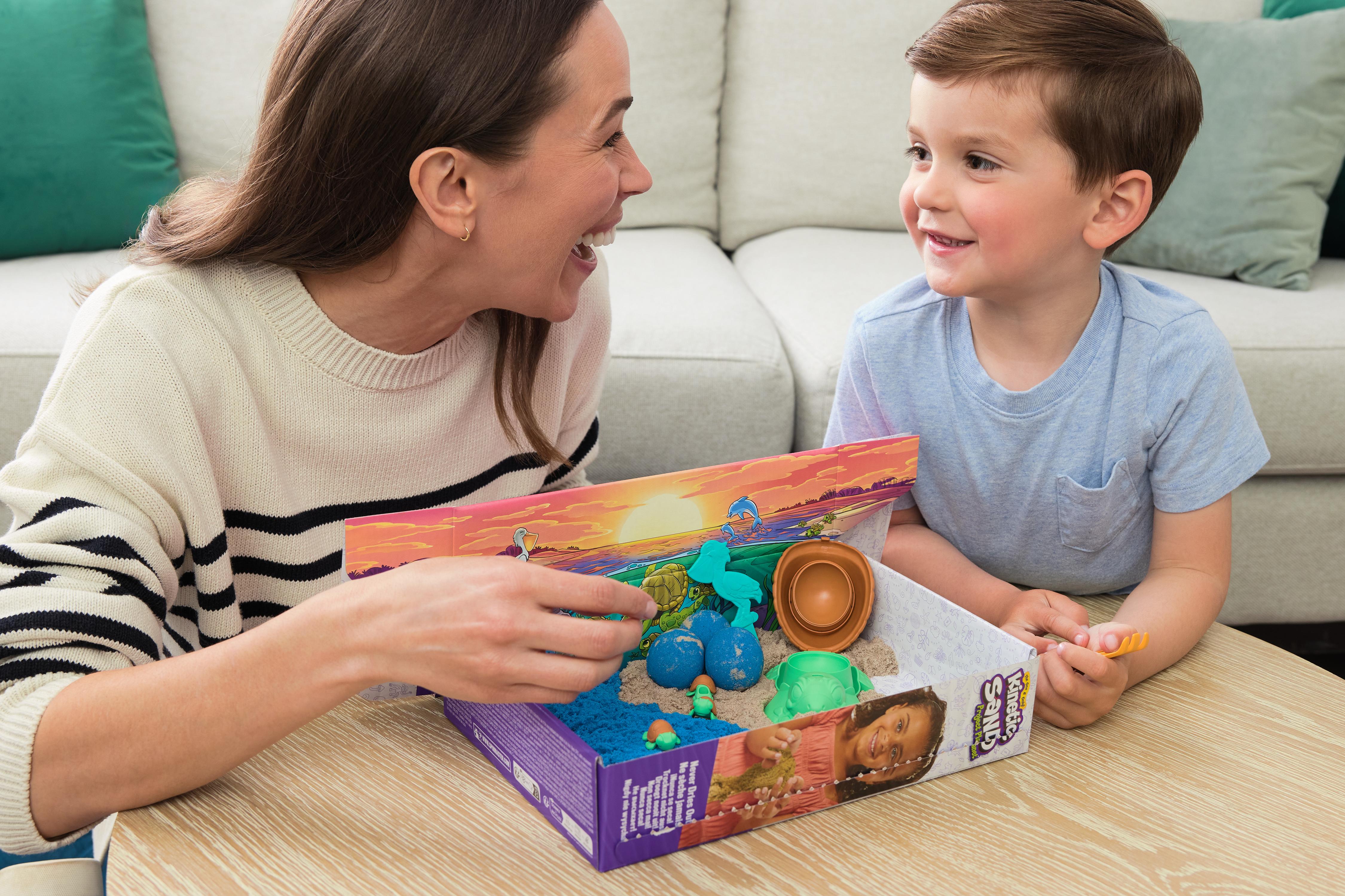 Un coffret marin pour découvrir le cycle de vie des tortues avec du sable Kinetic Sand. Le seul sable qui ne sèche pas et ne s'émiette pas pour des créations plus solides et tout en couleurs. Elaboré à partir de sable naturel. Mode de jeu ouvert pour des créations sans limites ! Utilise le sable et moule un œuf dans le ventre de la tortue en y cachant un bébé, fais-le éclore sur la plage et ramène-le dans la mer. Coffret comprenant 396 g de sable Kinetic Sand (bleu et naturel) et 7 accessoires dont 4 moules et outils et 3 bébé tortues. Inclus : 1 fiche éducative avec des informations sur les animaux peuplant nos océans. Jouet fabriqué à partir de 100% de plastique reyclé. Boîte fermée. A partir de 3 ans.