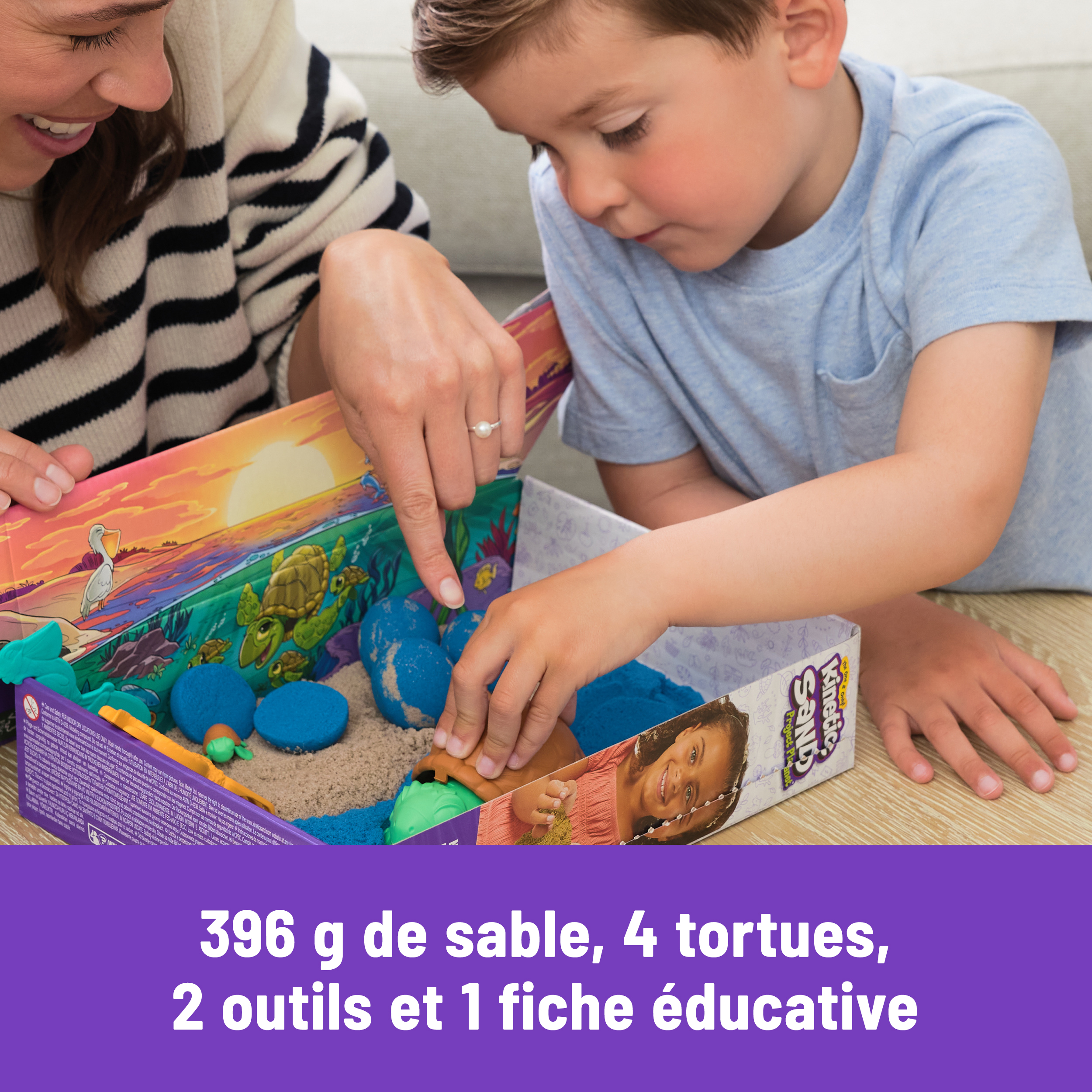| La boîte contient | Coffret comprenant 396 g de sable Kinetic Sand (bleu et naturel) et 7 accessoires dont 4 moules et outils et 3 bébé tortues. Inclus : 1 fiche éducative avec des informations sur les animaux peuplant nos océans. |