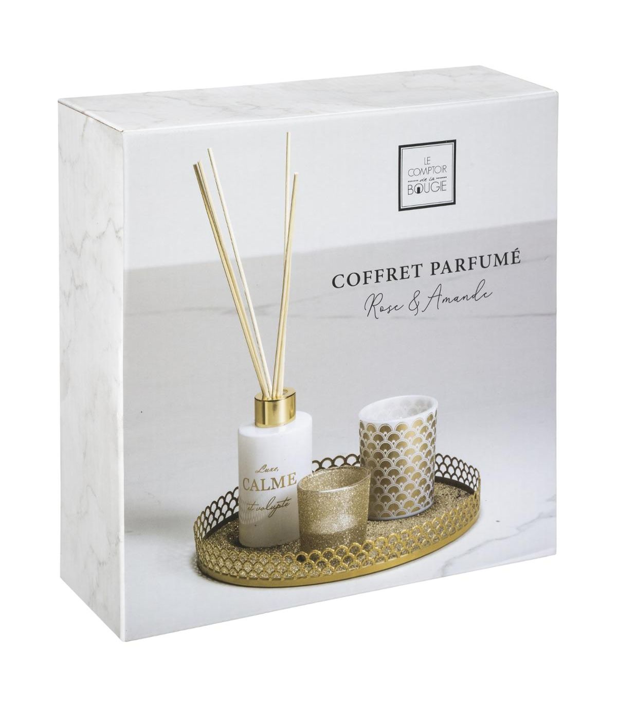 Le coffret comprend : Un plateau en métal, un Diffuseur de parfum et 6 bâtonnets, une Bougie parfumée dans un Pot en verre et un Bougeoir ---