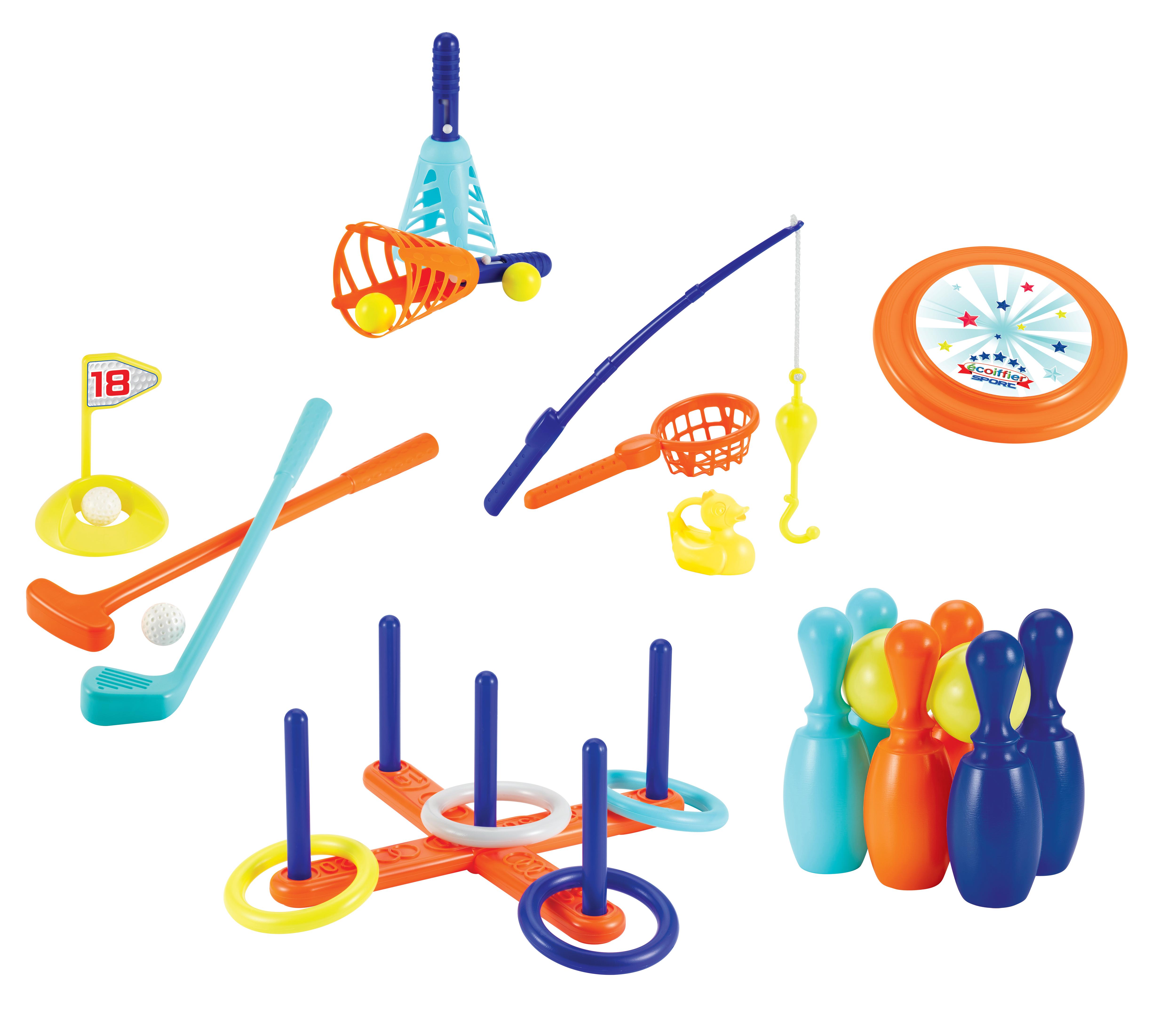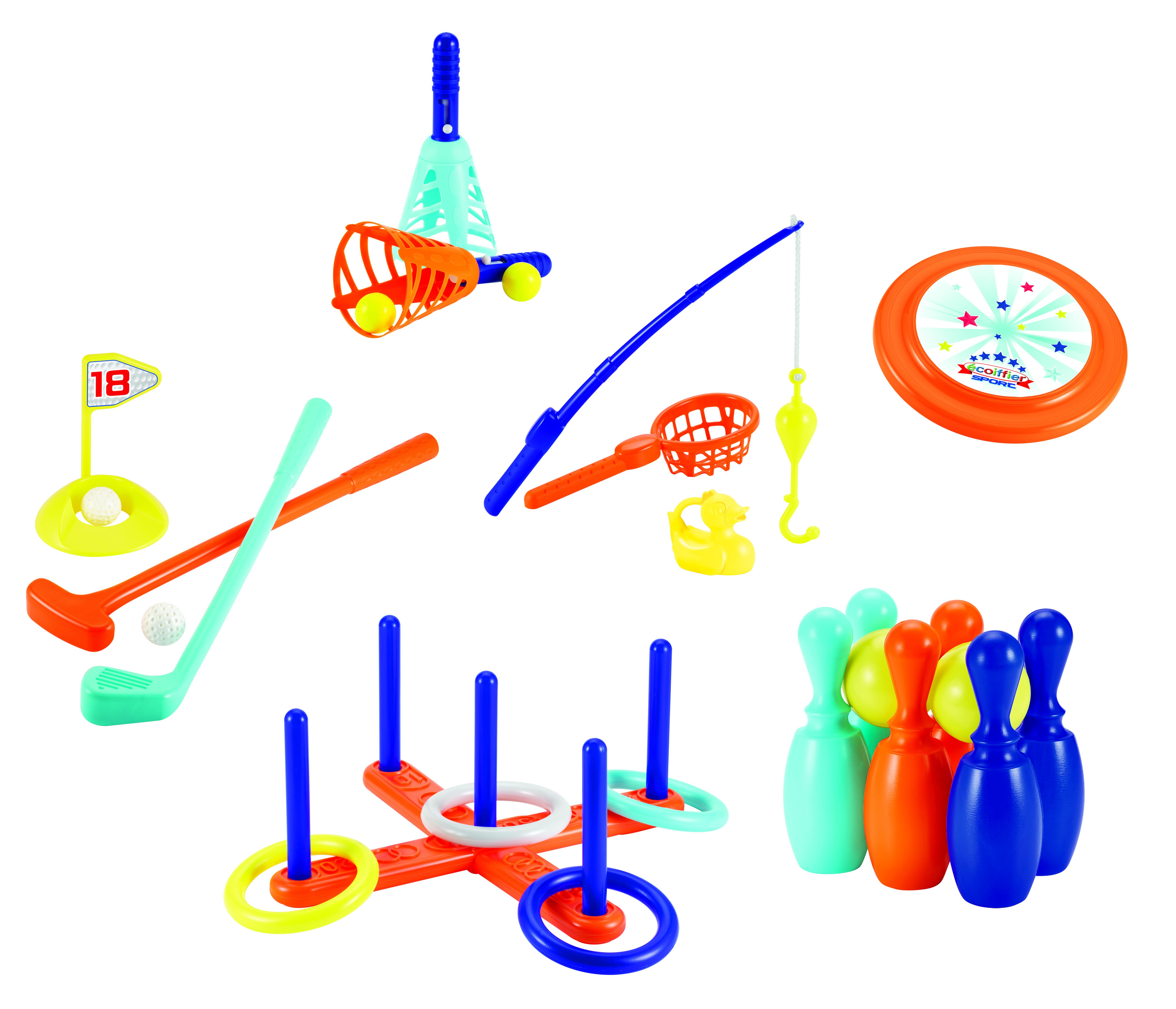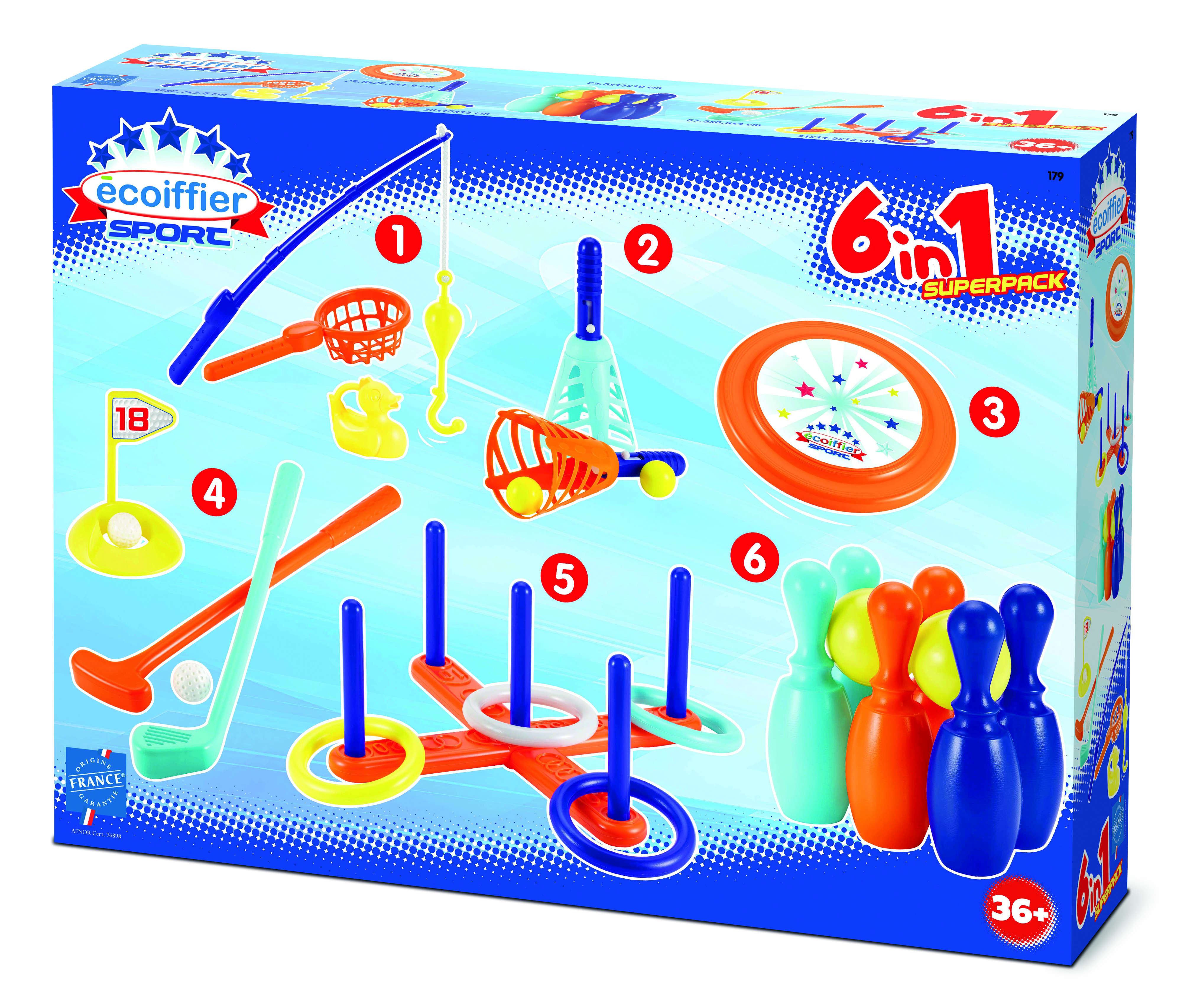 Ensemble contenant 6 jeux de sport : quilles, canne à pêche avec son grand hameçon pour pêcher en toute sécurité accompagnée d’un canard et d’une épuisette, lances balles, golf, jeux croix 4 anneaux et disque à lancer. Conseillè dès 36 mois. Origine France Garantie.