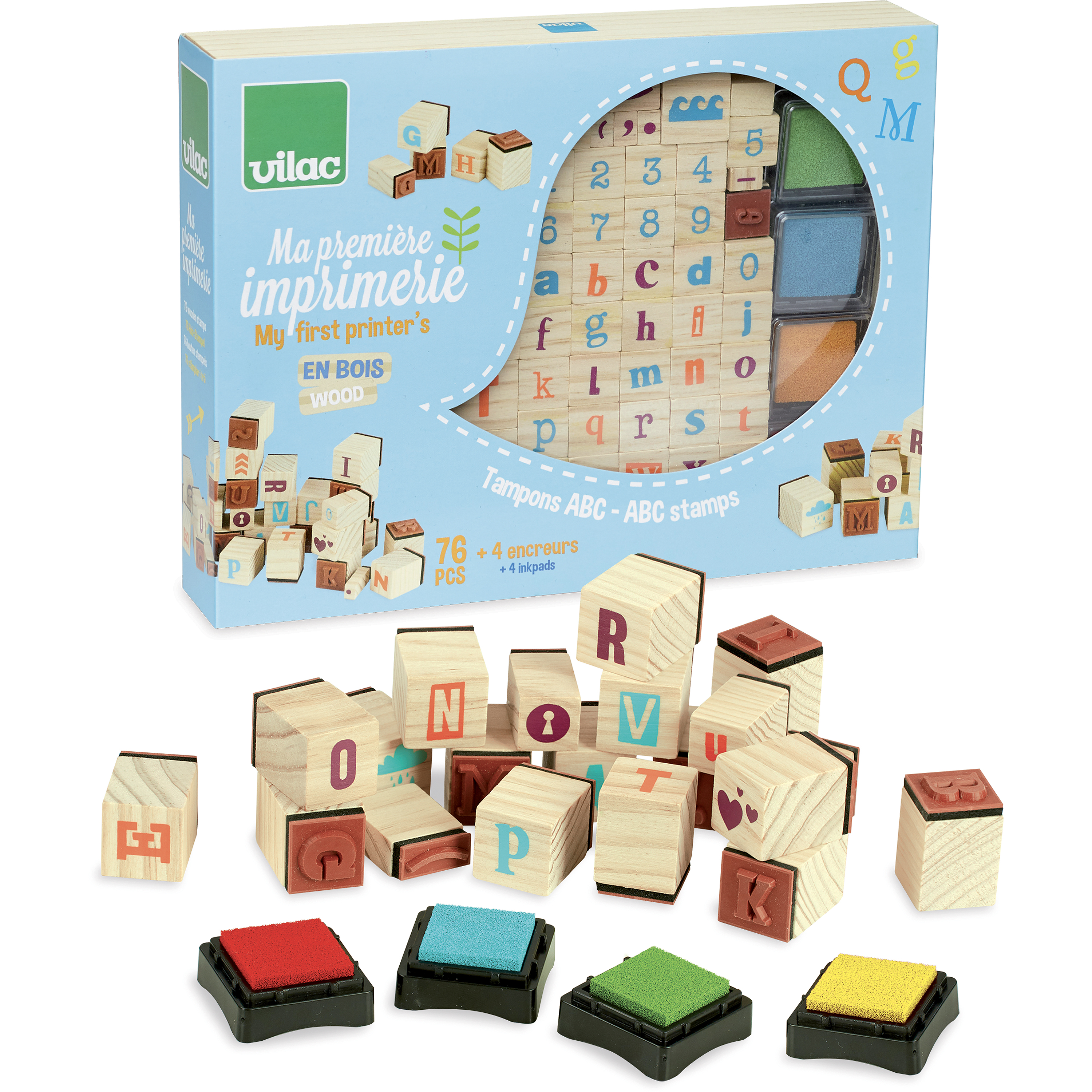 Pour jouer aux apprentis imprimeurs, ce coffret très complet contient tout l'alphabet : majuscules et minuscules ainsi que la ponctuation et autres éléments de décoration. 76 pièces et 4 tampons encreurs. Livré dans un coffret en bois. A partir de 4 ans.