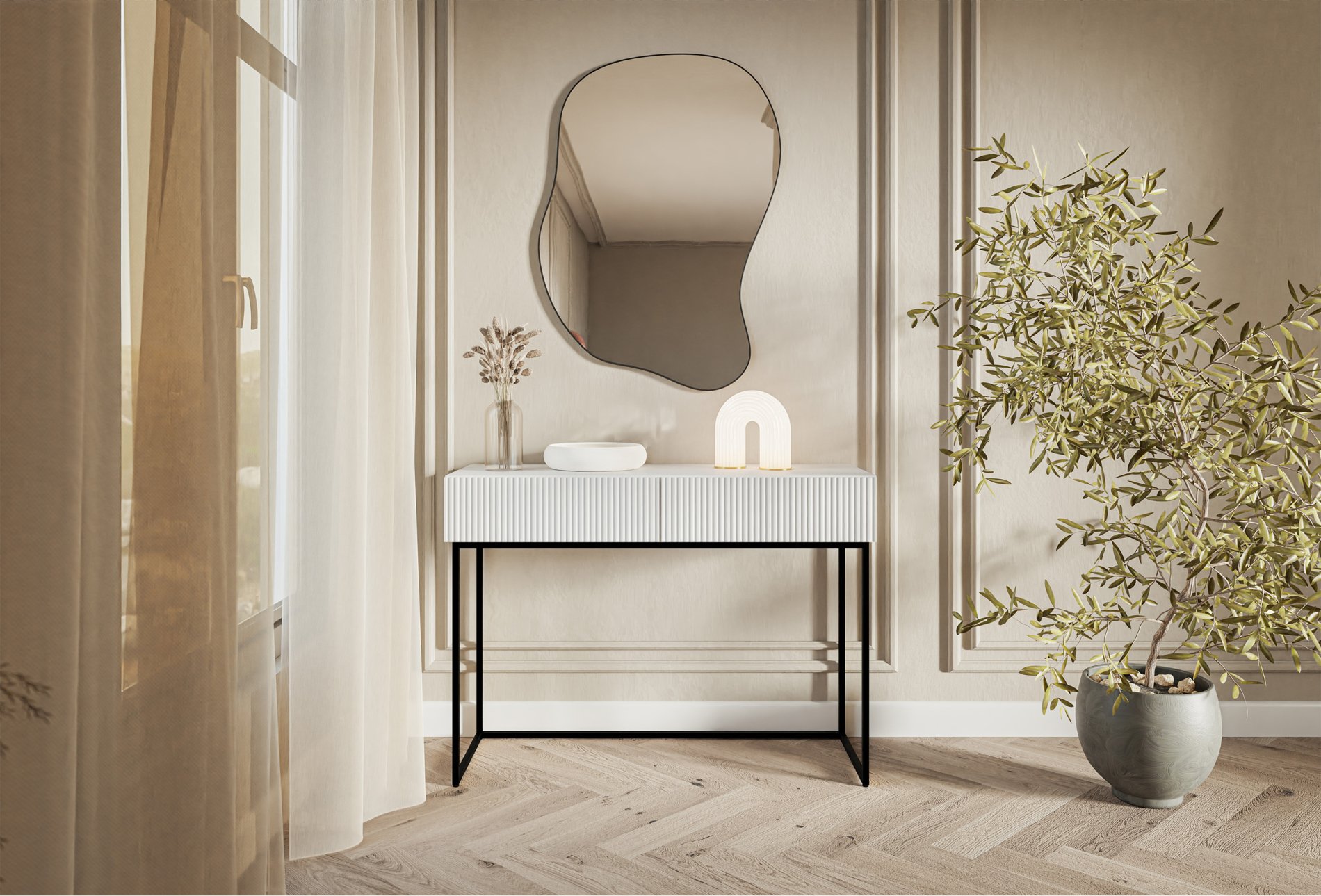 La coiffeuse Veldio allie le minimalisme à une touche de design sous la forme d'un liseré tendance. La façade biseautée confère à l'ensemble un caractère non conventionnel - en combinaison avec de grandes plantes colorées ou des accessoires élégants, ce meuble sera du plus bel effet. La coiffeuse dispose de deux tiroirs spacieux, grâce auxquels vous pouvez ranger vos cosmétiques ou vos bijoux. En suspendant un miroir avec éclairage au-dessus de la table, vous créerez un coin de détente plein d'ambiance. Un autre avantage de ce meuble réside dans ses pieds solides sous la forme d'un cadre en acier peint par poudrage, qui lui confèrent une stabilité maximale tout en apportant une touche d'élégance à la pièce. Le cadre de la coiffeuse permet à la chaise de se déplacer librement, car il ne comporte pas une seule latte transversale.