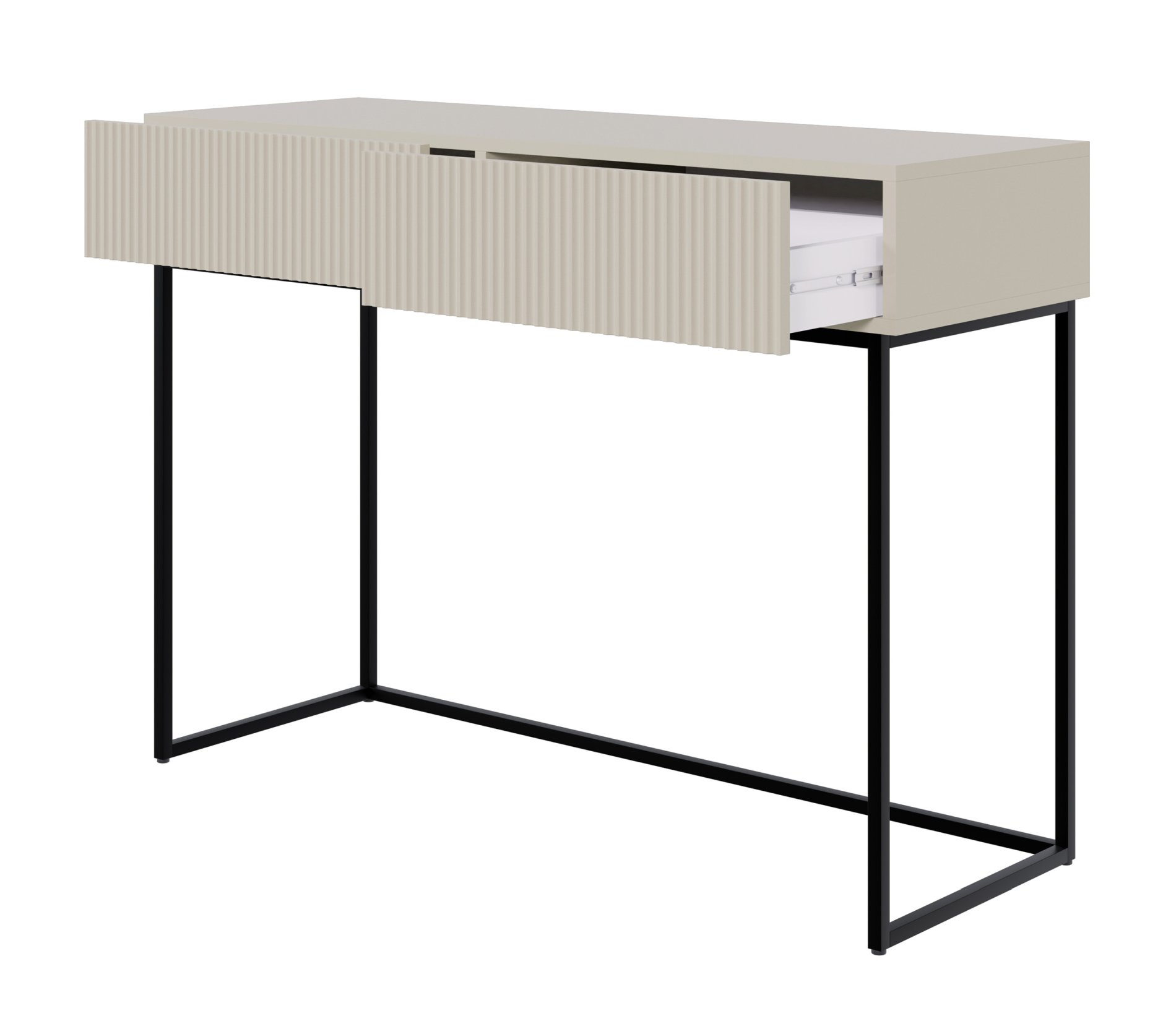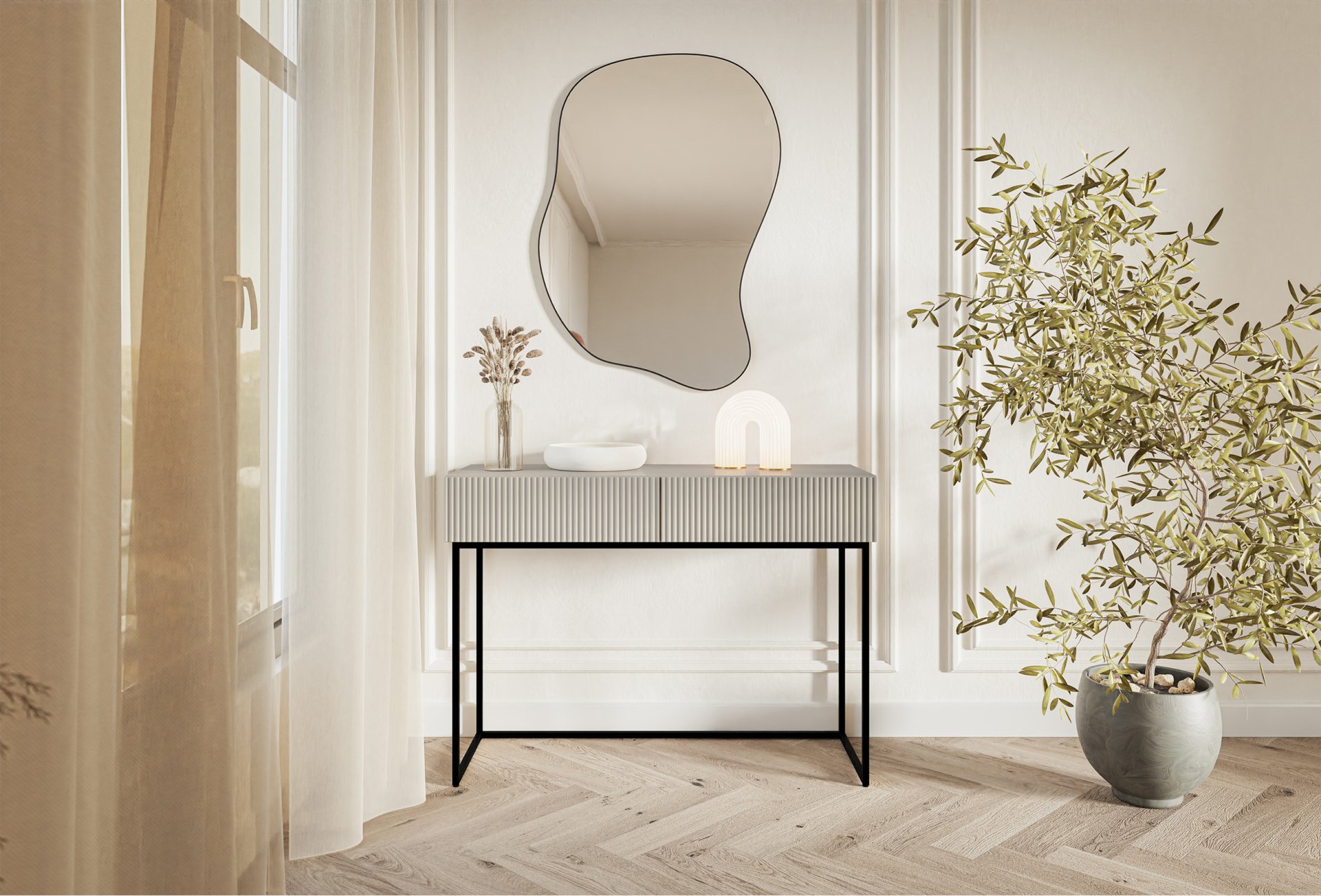 La coiffeuse Veldio allie le minimalisme à une touche de design sous la forme d'un liseré tendance. La façade biseautée confère à l'ensemble un caractère non conventionnel. La coiffeuse dispose de deux tiroirs spacieux, parfaits pour ranger vos cosmétiques ou bijoux. Un autre avantage de ce meuble réside dans ses pieds solides en cadre d'acier peint par poudrage, qui assurent une excellente stabilité tout en apportant une touche d'élégance à la pièce.