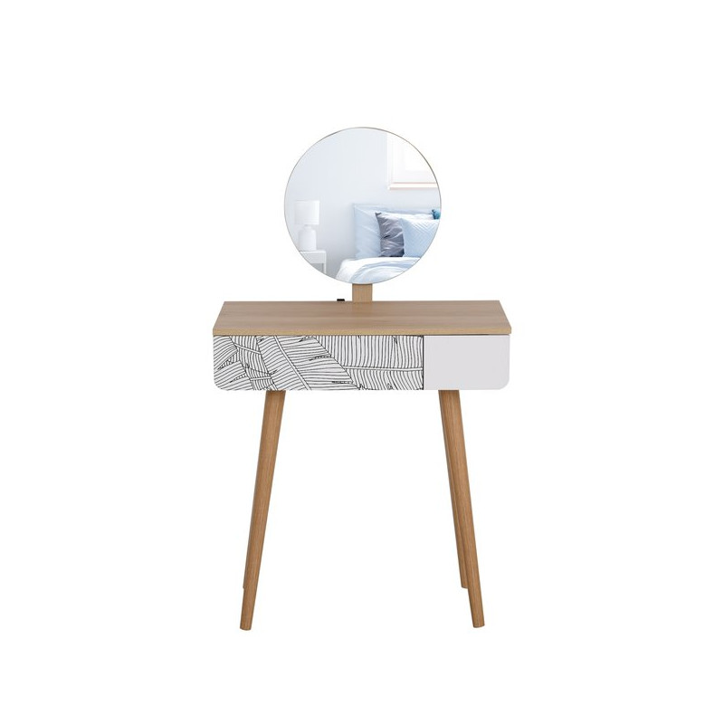 Originale et utile, la coiffeuse design Ornella de MYCOCOONING s'inscrit dans la tendance déco scandinave. Son piètement effilé en bois lui donne beaucoup d'allure. Avec ses couleurs naturelles, elle peut prendre place aussi bien dans une chambre que dans un dressing. Le joli miroir rond offre un grand confort pour vous coiffer et vous maquiller. Le large plateau accueillera vos peignes, brosses et accessoires tandis que les cosmétiques et produits de maquillage pourront être rangés dans le tiroir coulissant. Les motifs graphiques à l'avant apportent toute la modernité au meuble. Couleur : blanc Matériaux principaux : Panneau de particules classe E1 Dim. totales : 70I x 39P x 119-128H cm Dimensions intérieures du tiroir : 53I x 32P x 6H cm Dim. miroir : Ø 39cm Hauteur de la coiffeuse : 75cm Charge max. recommandée : 50 kg Livraison effectuée en un colis