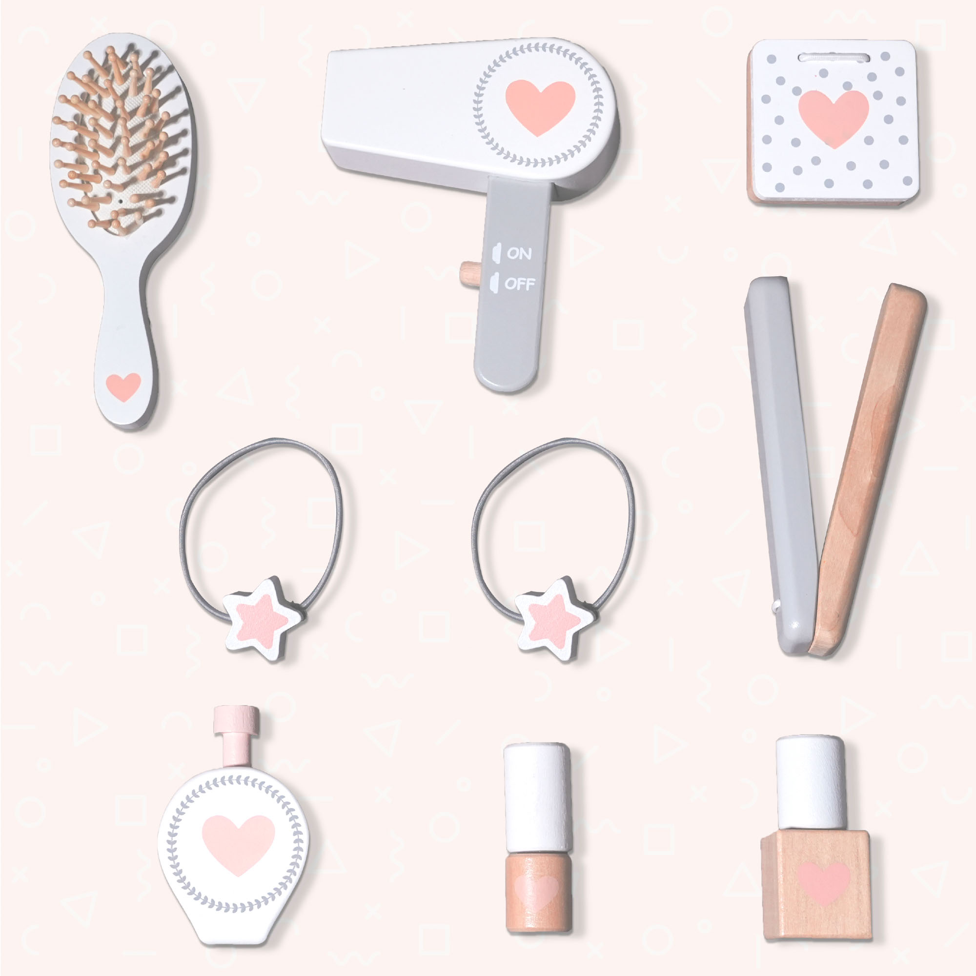 - 9 accessoires inclus : brosse à cheveux, sèche-cheveux, fard à paupières, 2 élastiques, lisseur, parfum, vernis à ongles, rouge à lèvres
